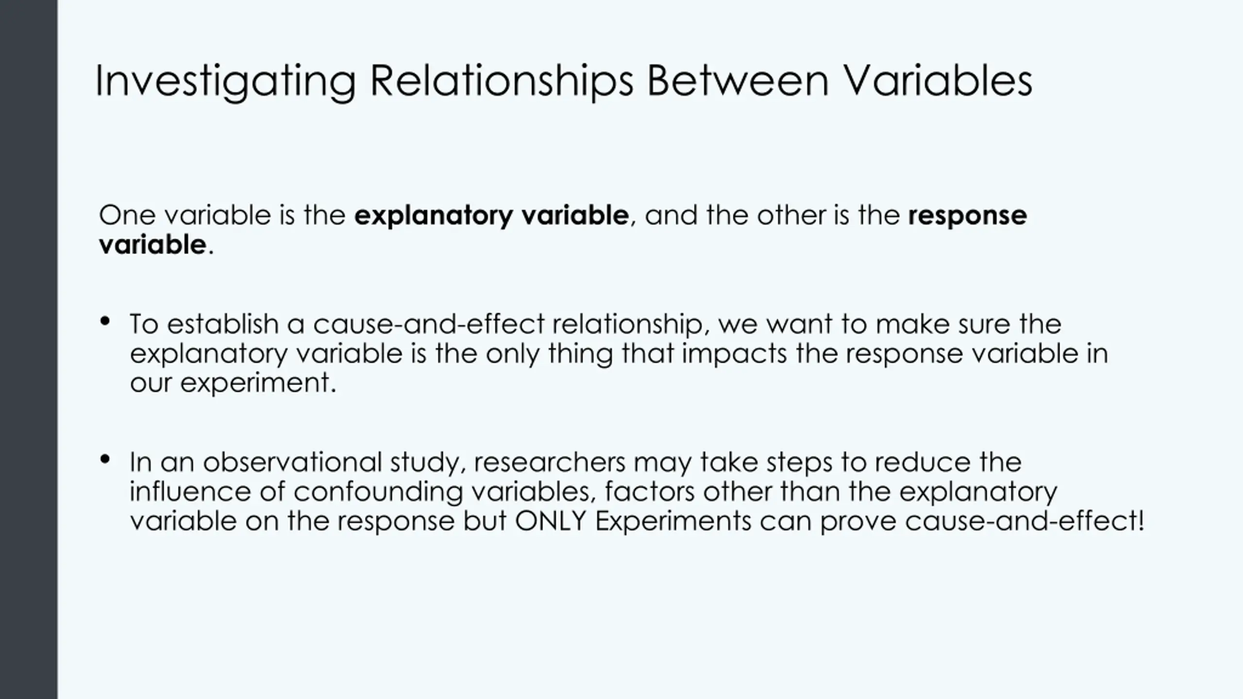 Investigating Relationships Between Variables One variable is the explanatory variable, and the other is the response variable. To establish a cause-and-effect relationship, we want to make sure the explanatory variable is the only thing that impacts the response variable in our experiment. In an observational study, researchers may take steps to reduce the influence of confounding variables, factors other than the explanatory variable on the response but ONLY Experiments can prove cause-and-effect!