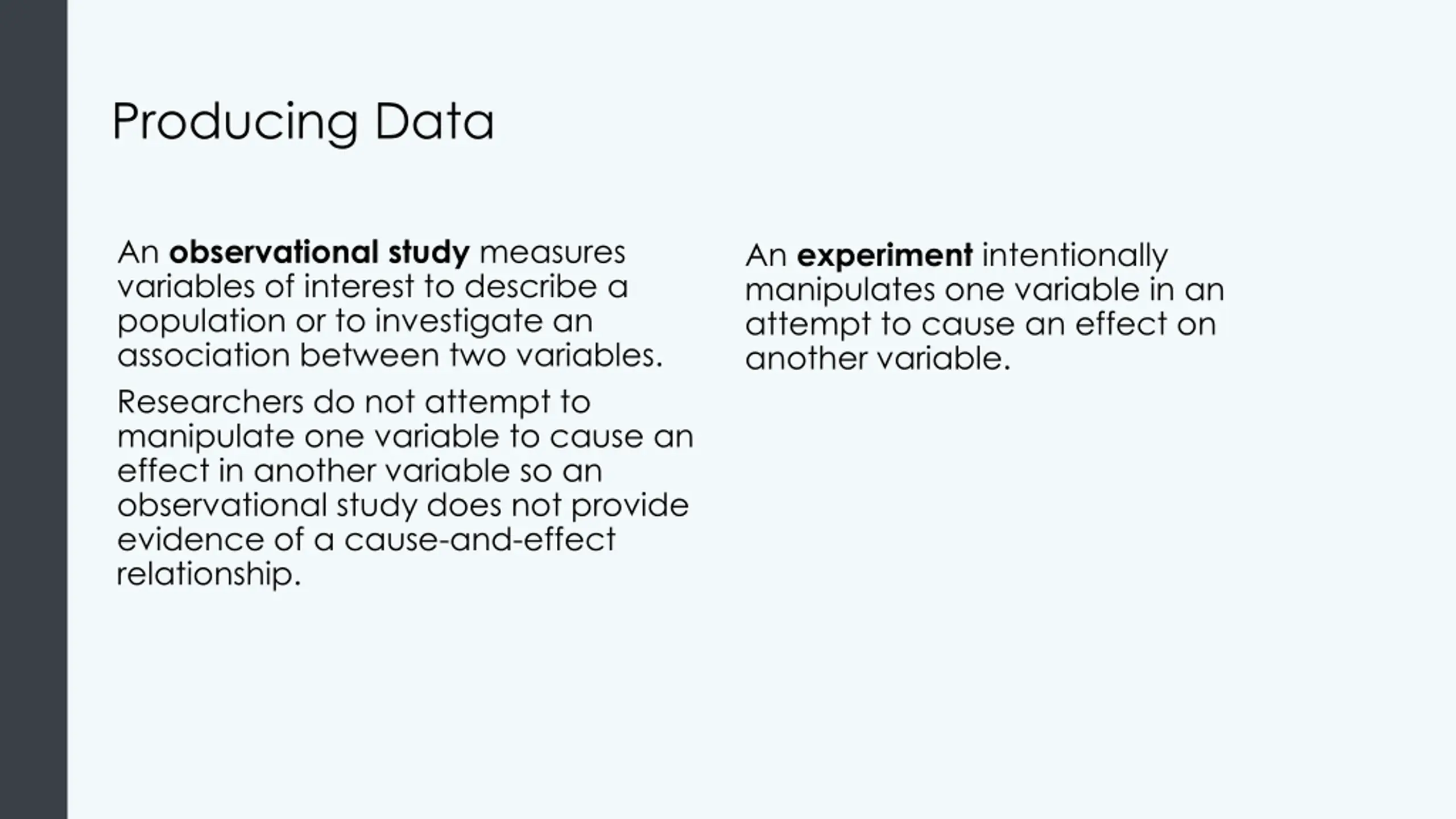 Producing Data An observational study measures variables of interest to describe a population or to investigate an association between two variables. Researchers do not attempt to manipulate one variable to cause an effect in another variable so an observational study does not provide evidence of a cause-and-effect relationship. An experiment intentionally manipulates one variable in an attempt to cause an effect on another variable.
