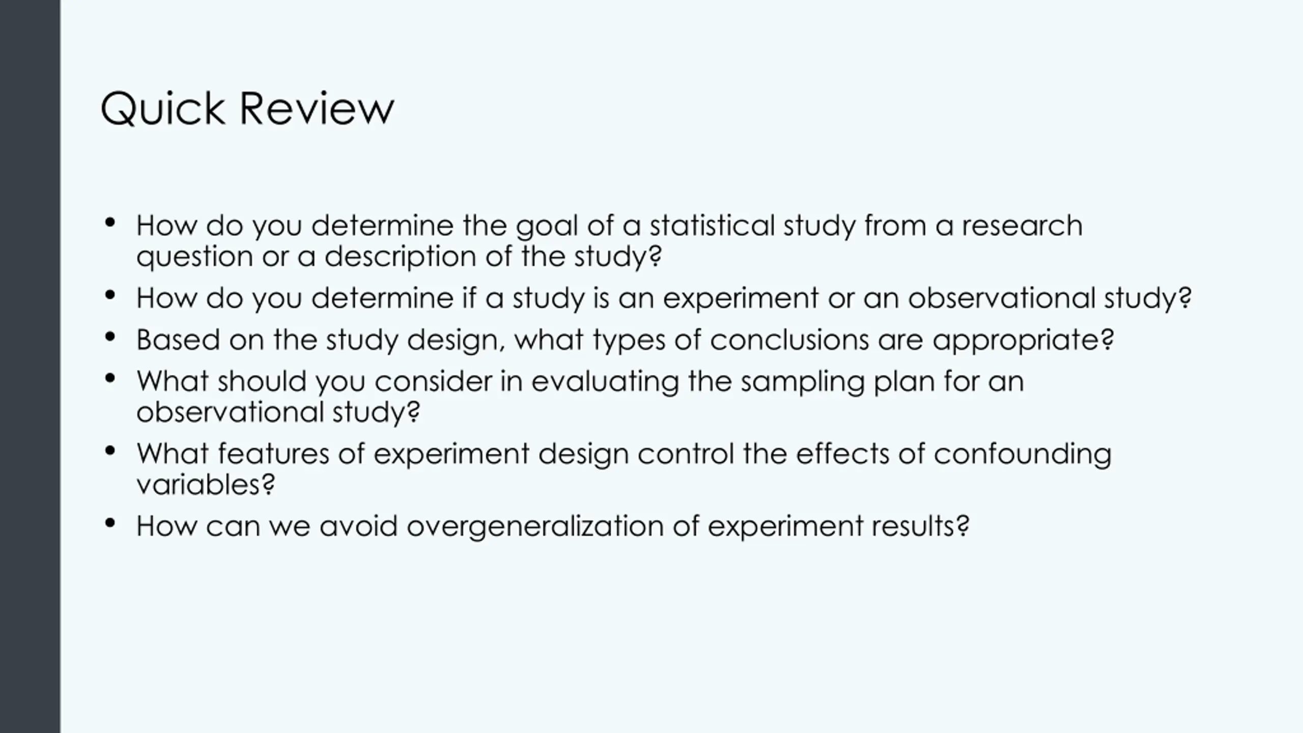 Quick Review How do you determine the goal of a statistical study from a research question or a description of the study? How do you determine if a study is an experiment or an observational study? Based on the study design, what types of conclusions are appropriate? What should you consider in evaluating the sampling plan for an observational study? What features of experiment design control the effects of confounding variables? How can we avoid overgeneralization of experiment results?