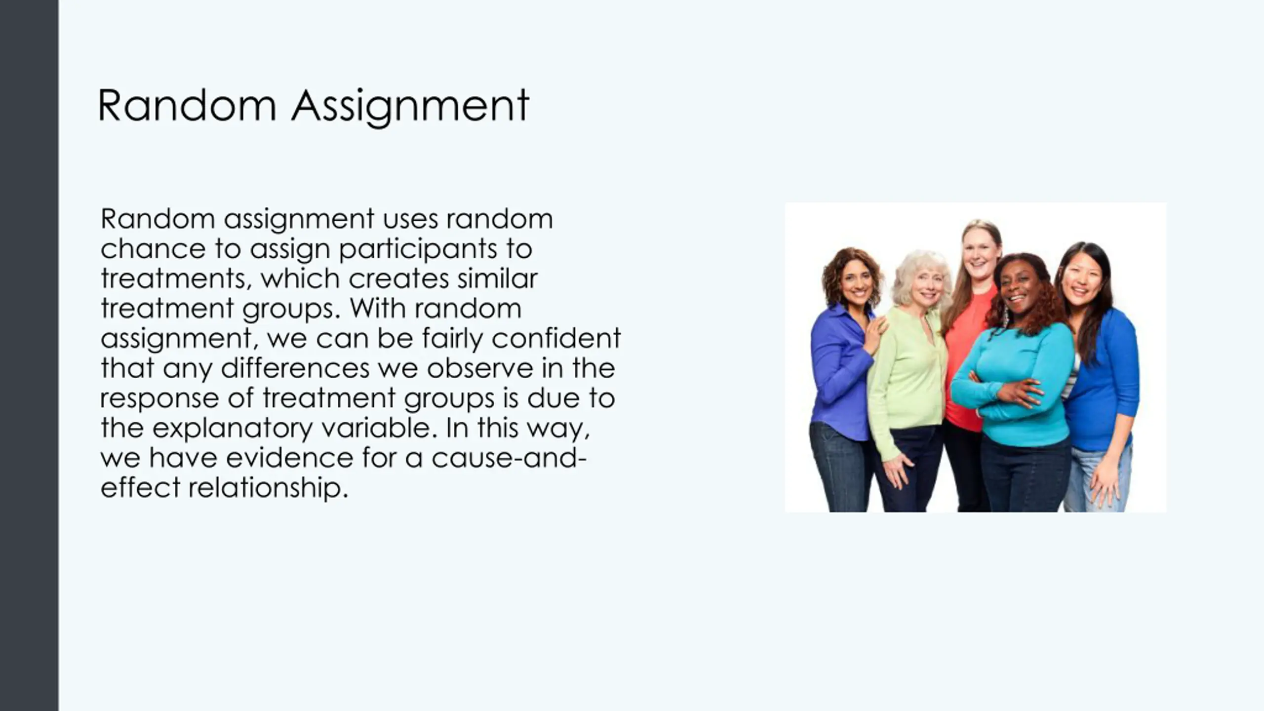 Random Assignment Random assignment uses random chance to assign participants to treatments, which creates similar treatment groups. With random assignment, we can be fairly confident that any differences we observe in the response of treatment groups is due to the explanatory variable. In this way, we have evidence for a cause-and- effect relationship.