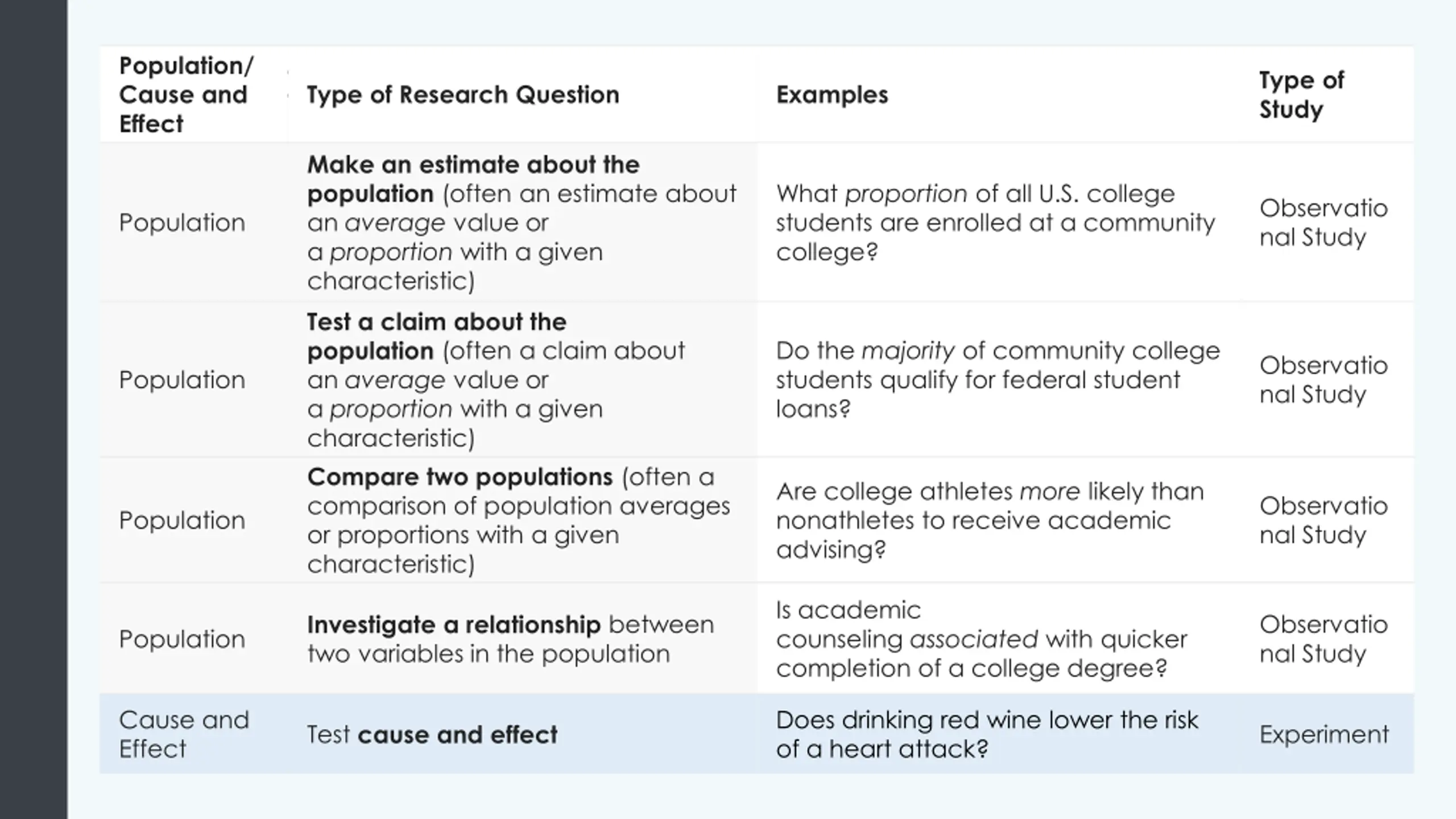Research Questions Cause and Effect Make an estimate about the population (often an estimate about an average value or a proportion with a given characteristic) Test a claim about the population (often a claim about an average value or a proportion with a given characteristic) Compare two populations (often a comparison of population averages or proportions with a given characteristic) Population/ Type of Study Type of Research Question Examples What proportion of all U.S. college students are enrolled at a community college? Observatio nal Study Population Do the majority of community college students qualify for federal student loans? Observatio nal Study Population Are college athletes more likely than nonathletes to receive academic advising? Observatio nal Study Population Is academic counseling associated with quicker completion of a college degree? Investigate a relationship between two variables in the population Observatio nal Study Population Cause and Effect Does drinking red wine lower the risk of a heart attack? Test cause and effect Experiment