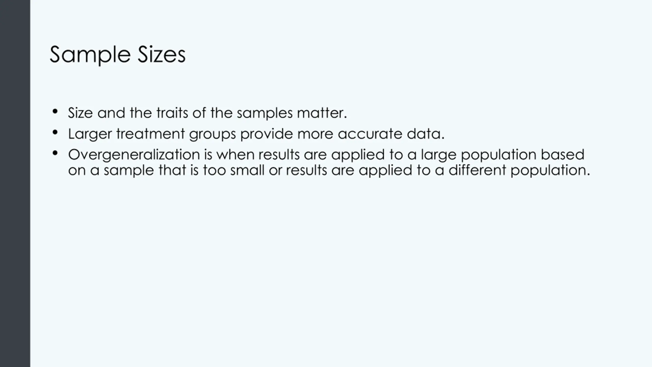 Sample Sizes Size and the traits of the samples matter. Larger treatment groups provide more accurate data. Overgeneralization is when results are applied to a large population based on a sample that is too small or results are applied to a different population.