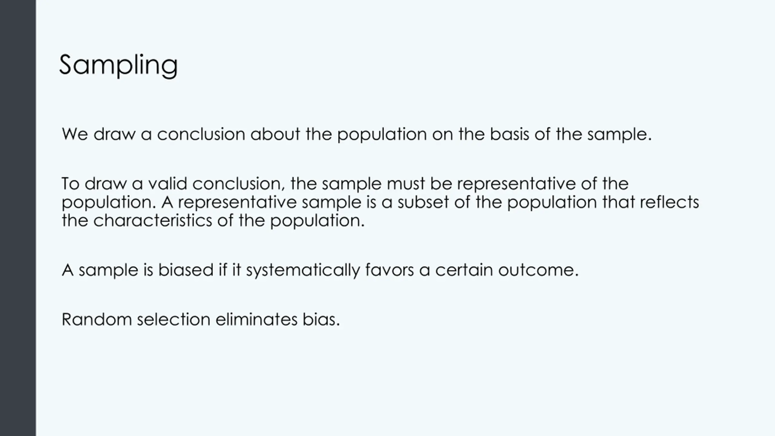 Sampling We draw a conclusion about the population on the basis of the sample. To draw a valid conclusion, the sample must be representative of the population. A representative sample is a subset of the population that reflects the characteristics of the population. A sample is biased if it systematically favors a certain outcome. Random selection eliminates bias.