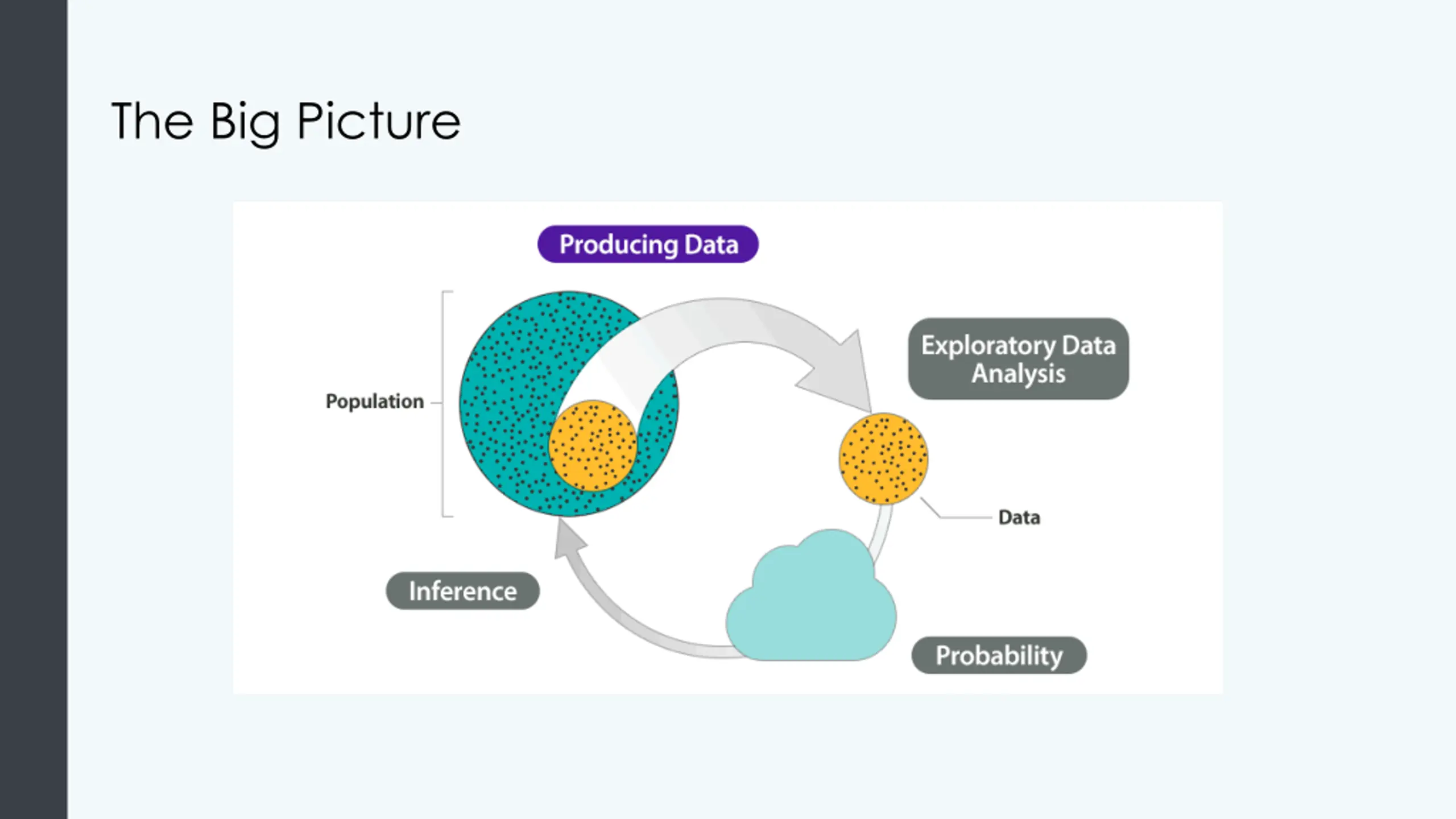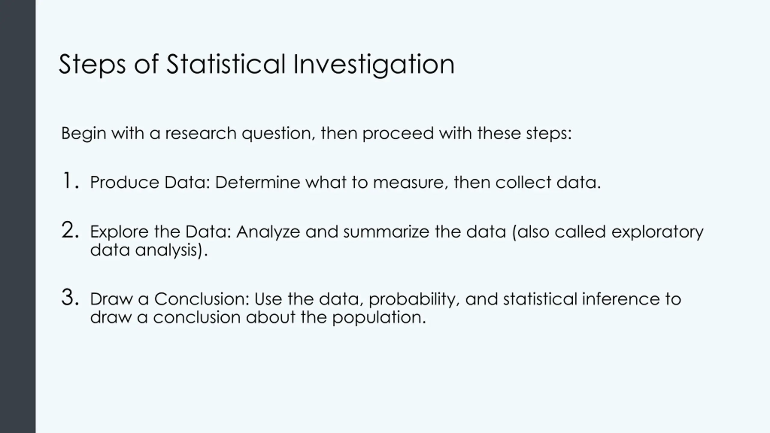 Steps of Statistical Investigation Begin with a research question, then proceed with these steps: 1. Produce Data: Determine what to measure, then collect data. 2. Explore the Data: Analyze and summarize the data (also called exploratory data analysis). 3. Draw a Conclusion: Use the data, probability, and statistical inference to draw a conclusion about the population.