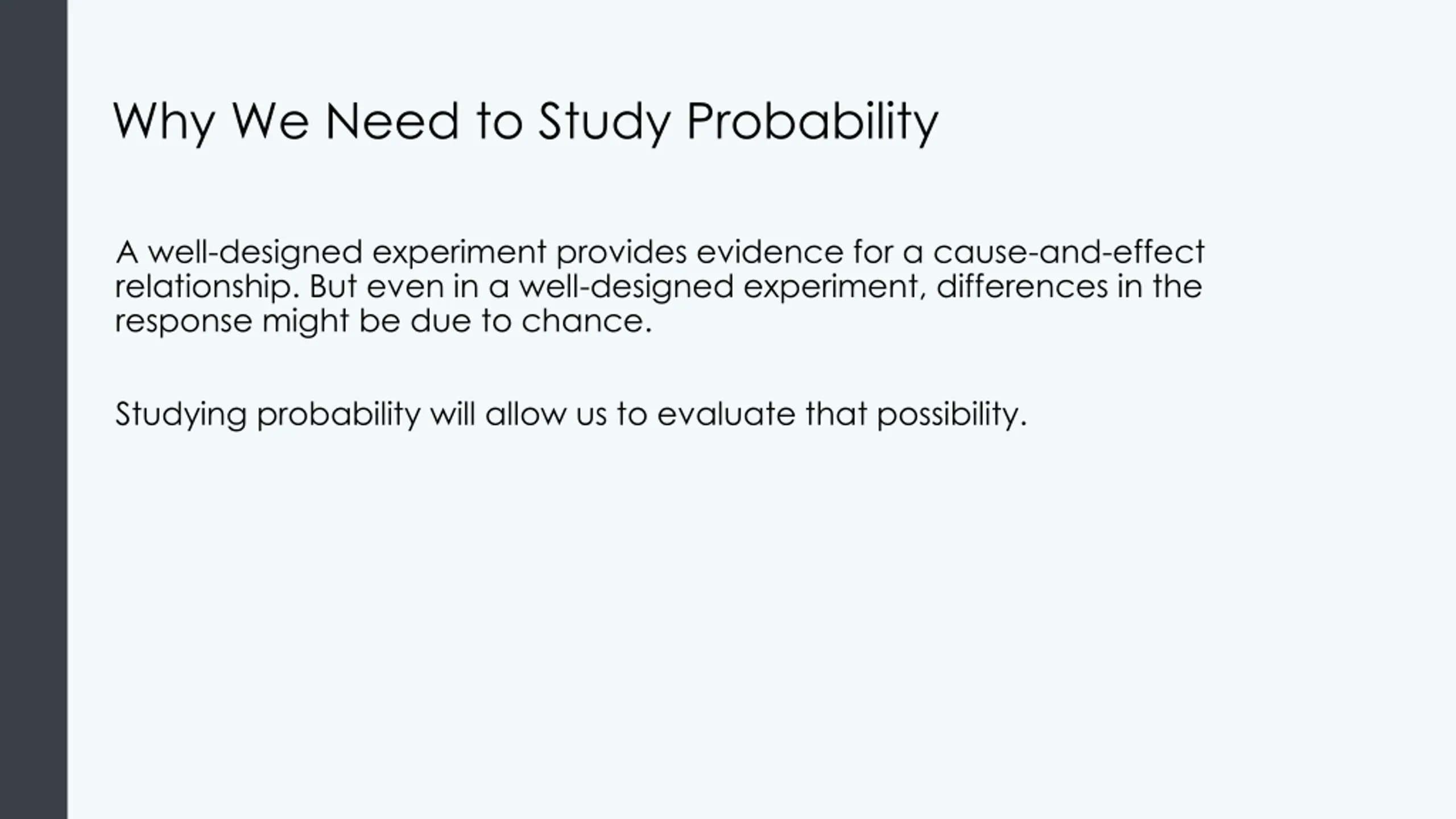 Why We Need to Study Probability A well-designed experiment provides evidence for a cause-and-effect relationship. But even in a well-designed experiment, differences in the response might be due to chance. Studying probability will allow us to evaluate that possibility.