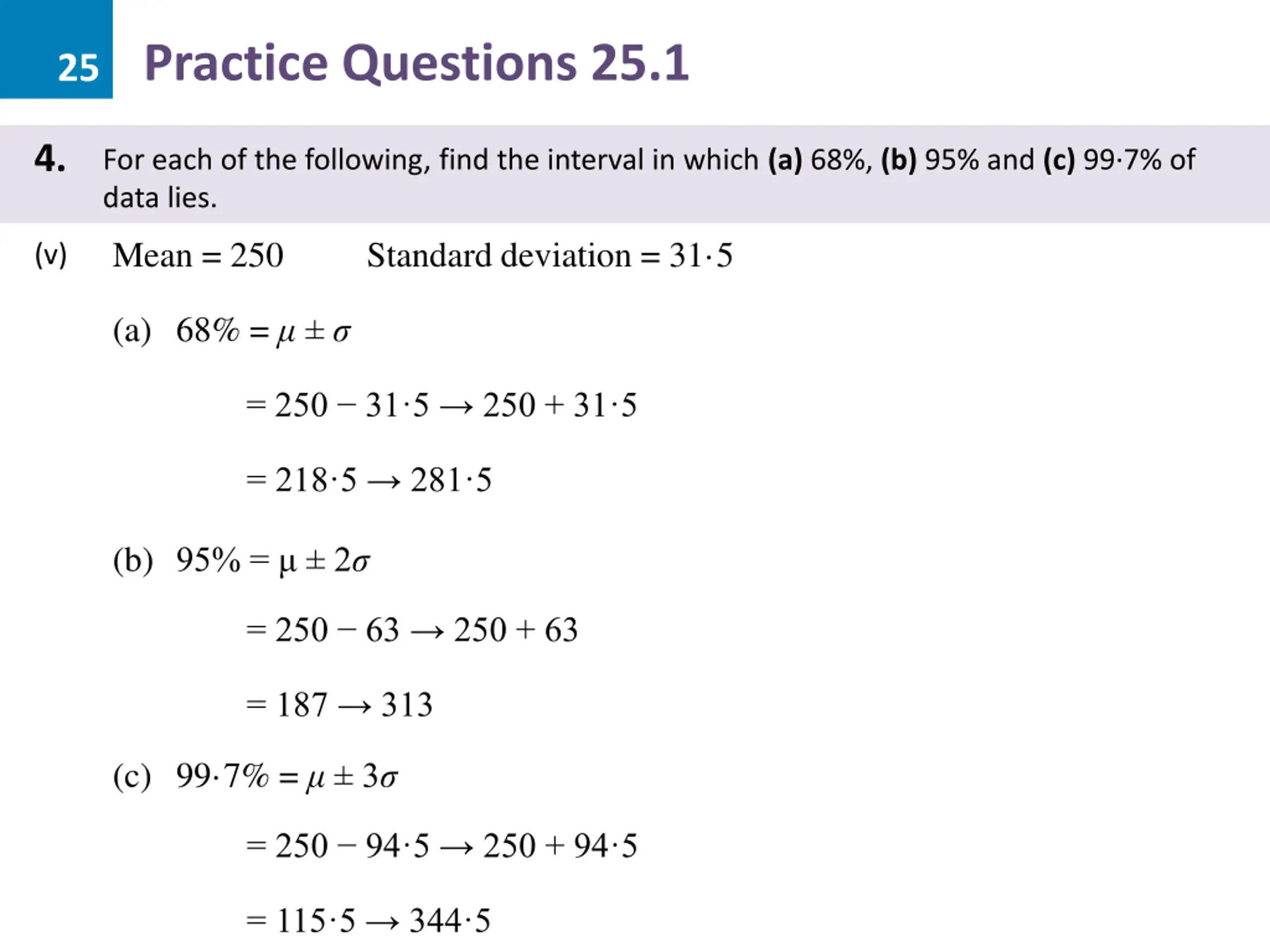25 Practice Questions 25.1 4. For each of the following, find the interval in which (a) 68%, (b) 95% and (c) 99 7% of data lies. Mean = 250 Standard deviation = 31 5 (v) (a) 68% = = 250 31 5 250 + 31 5 = 218 5 281 5 (b) 95% = 2 = 250 63 250 + 63 = 187 313 (c) 99 7% = 3 = 250 94 5 250 + 94 5 = 115 5 344 5