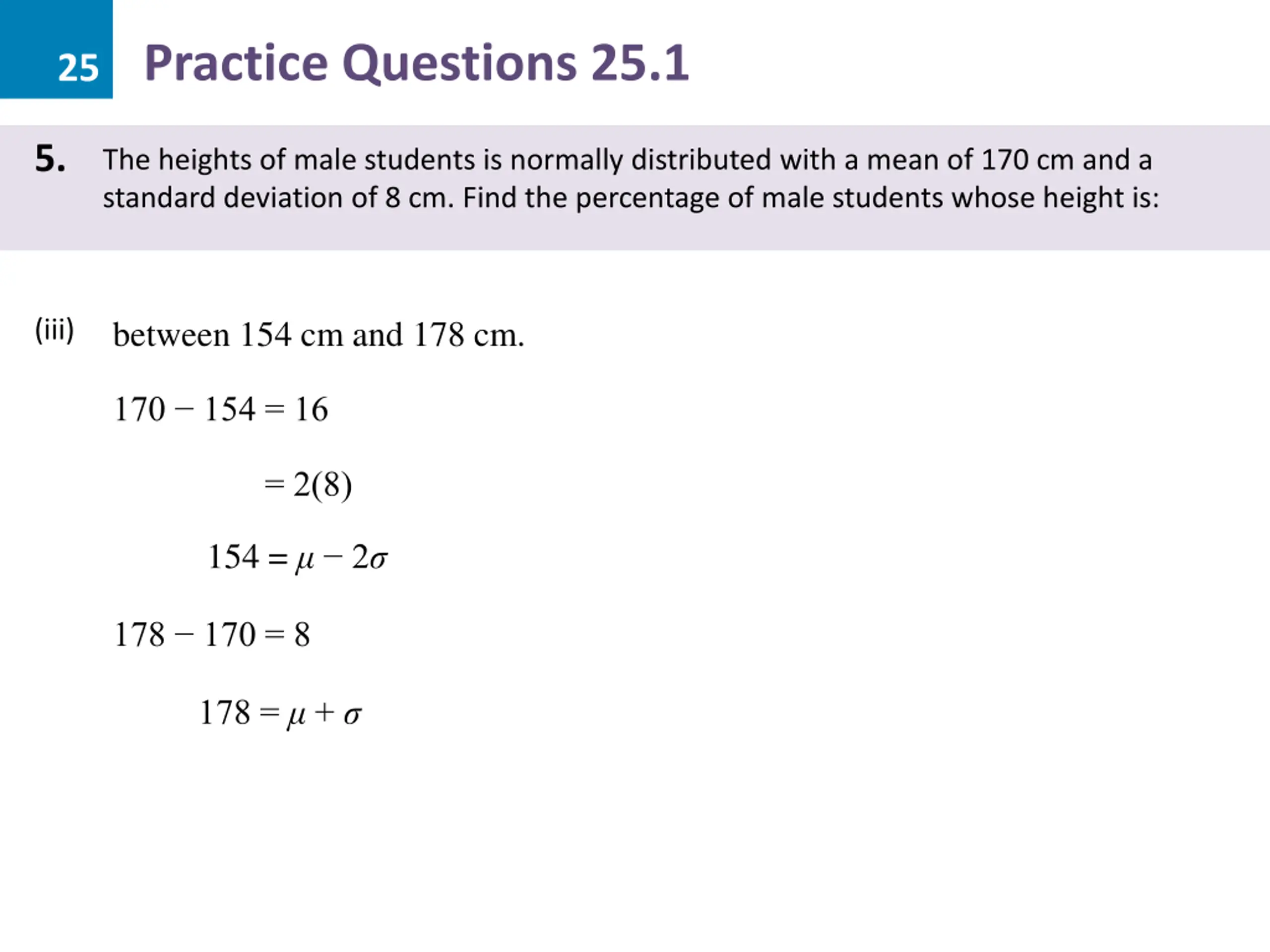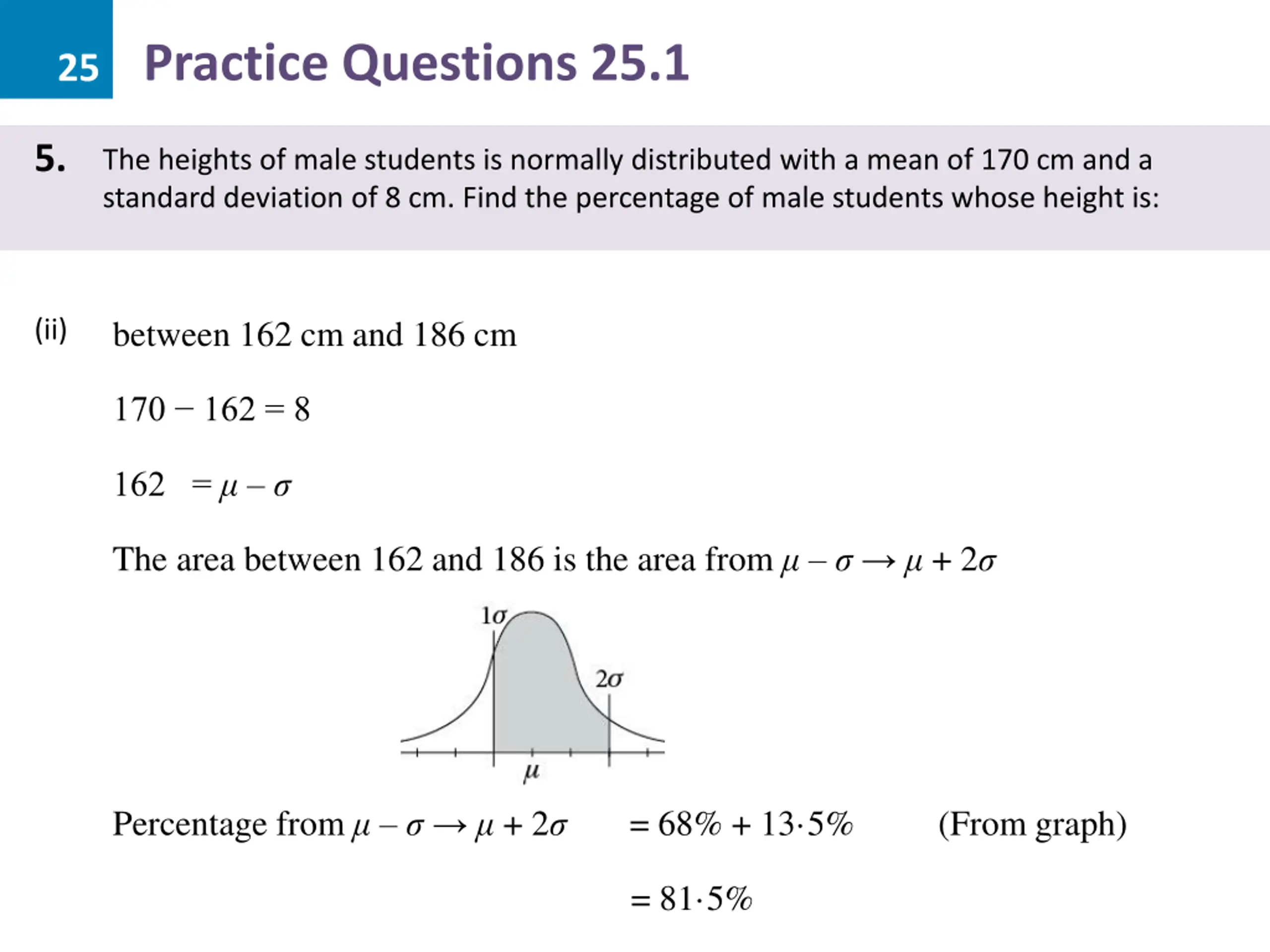 25 Practice Questions 25.1 5. The heights of male students is normally distributed with a mean of 170 cm and a standard deviation of 8 cm. Find the percentage of male students whose height is: between 154 cm and 178 cm. (iii) The area between 154 and 178 is the area from 2 + Percentage from 2 + = 13 5% + 68% = 81 5%