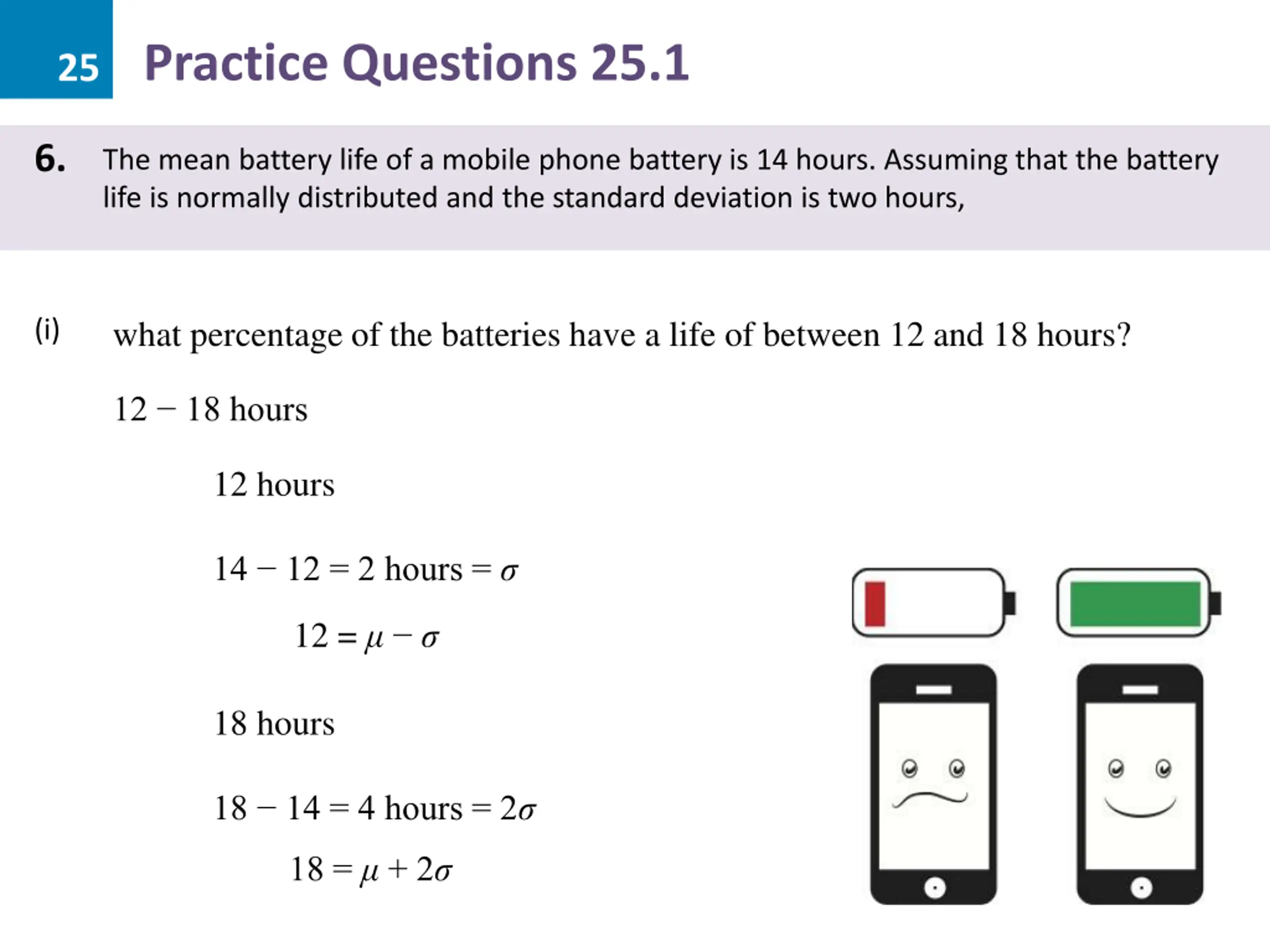 25 Practice Questions 25.1 6. The mean battery life of a mobile phone battery is 14 hours. Assuming that the battery life is normally distributed and the standard deviation is two hours, what percentage of the batteries have a life of between 12 and 18 hours? (i) The area between 12 and 18 hours is the area from + 2 12 18 hours = + 2 = 68% + 13 5% = 81 5%