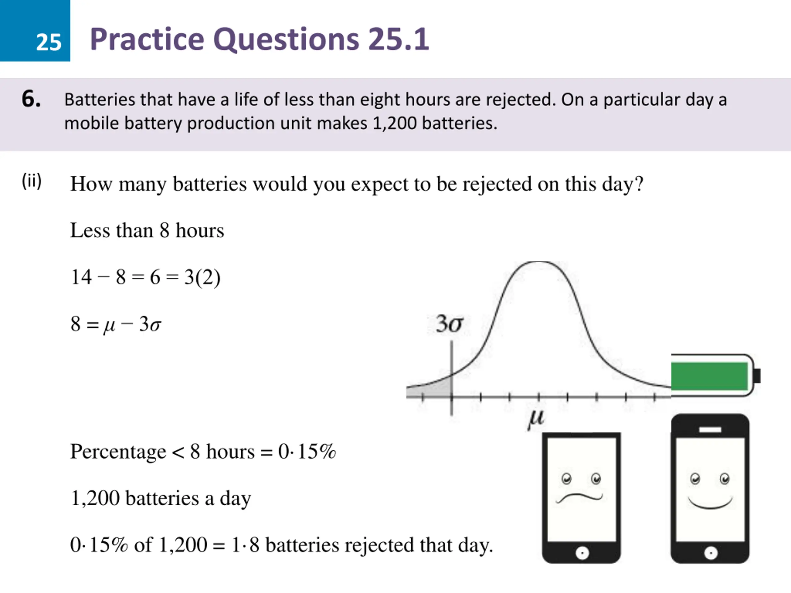 25 Practice Questions 25.1 6. Batteries that have a life of less than eight hours are rejected. On a particular day a mobile battery production unit makes 1,200 batteries. How many batteries would you expect to be rejected on this day? (ii) Less than 8 hours 14 8 = 6 = 3(2) 8 = 3 Percentage < 8 hours = 0 15% 1,200 batteries a day 0 15% of 1,200 = 1 8 batteries rejected that day.