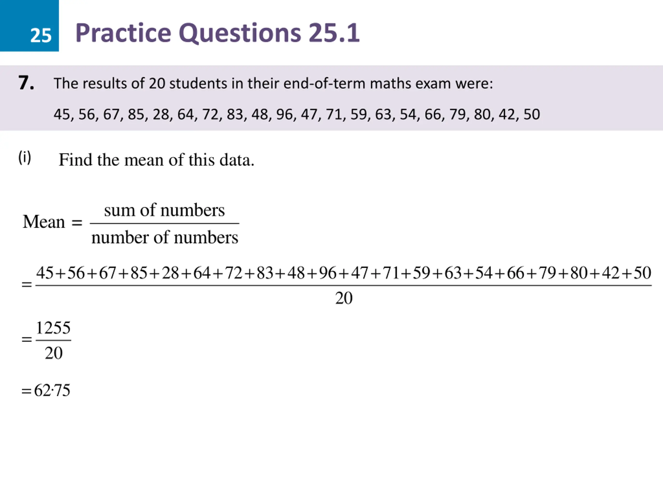 25 Practice Questions 25.1 7. The results of 20 students in their end-of-term maths exam were: 45, 56, 67, 85, 28, 64, 72, 83, 48, 96, 47, 71, 59, 63, 54, 66, 79, 80, 42, 50 Find the mean of this data. (i) sum of numbers number of numbers Mean = =45+56+67+85+28+64+72+83+48+96+47+71+59+63+54+66+79+80+42+50 20 =1255 20 =62 75