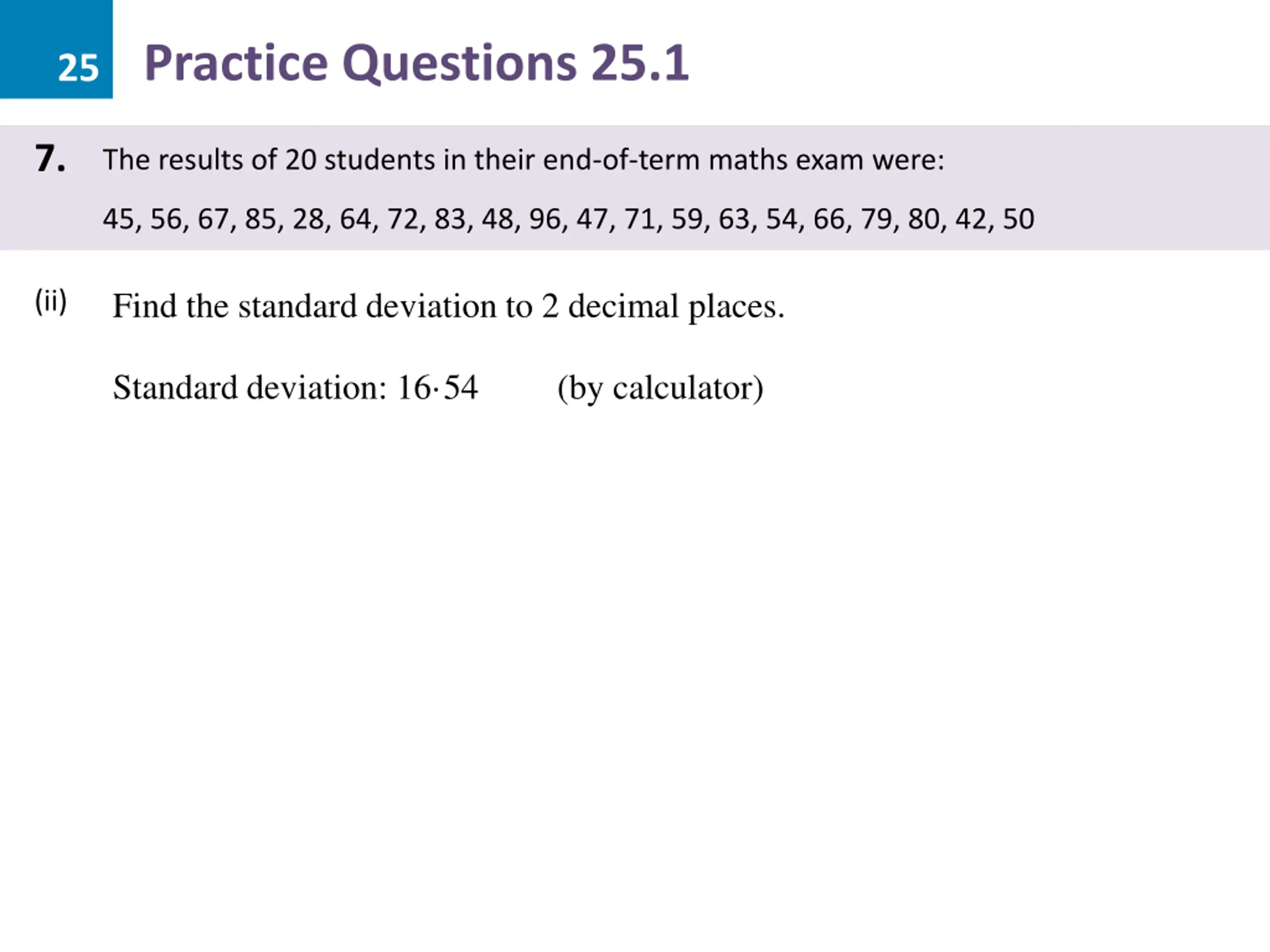25 Practice Questions 25.1 7. The results of 20 students in their end-of-term maths exam were: 45, 56, 67, 85, 28, 64, 72, 83, 48, 96, 47, 71, 59, 63, 54, 66, 79, 80, 42, 50 Find the standard deviation to 2 decimal places. (ii) Standard deviation: 16 54 (by calculator)