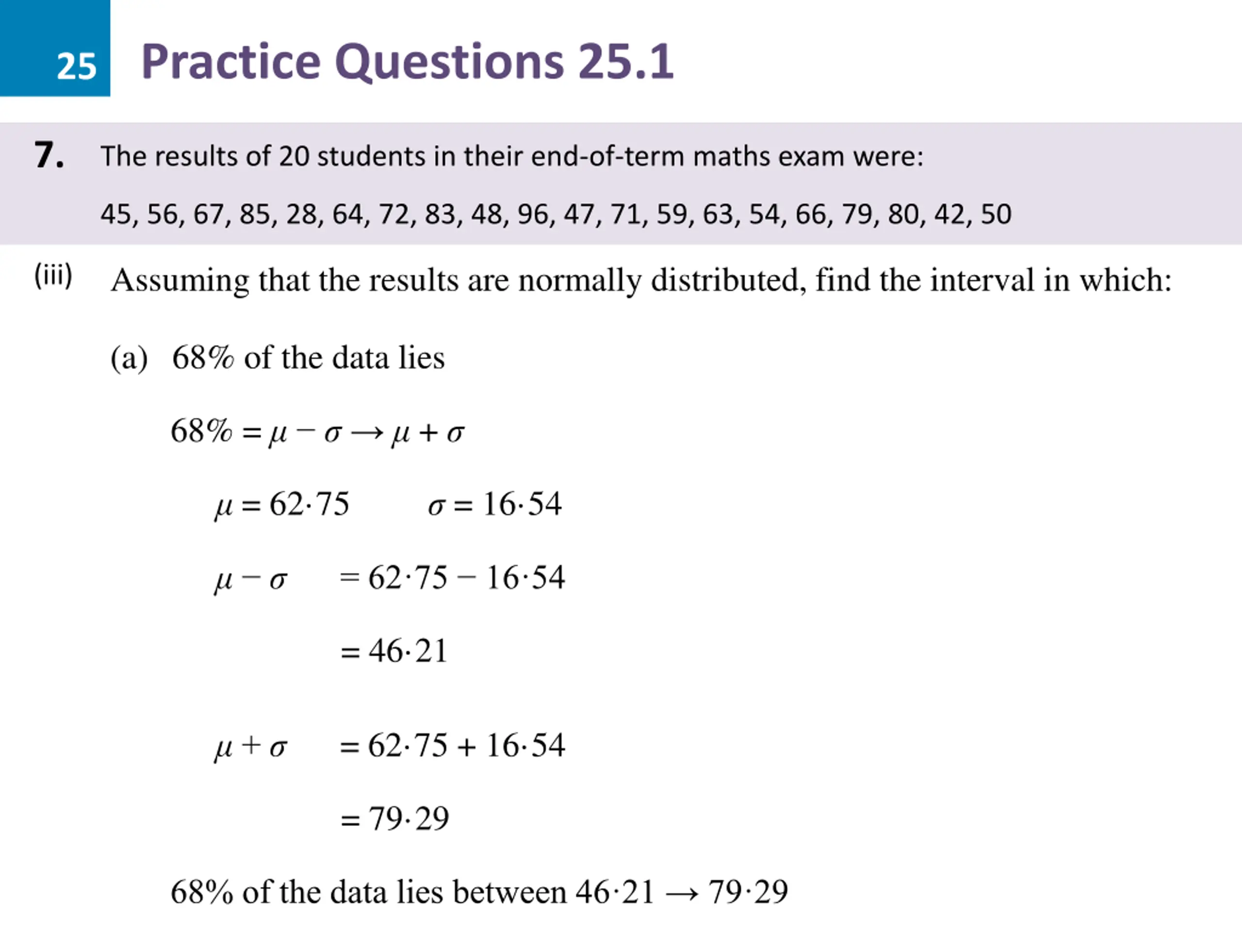25 Practice Questions 25.1 7. The results of 20 students in their end-of-term maths exam were: 45, 56, 67, 85, 28, 64, 72, 83, 48, 96, 47, 71, 59, 63, 54, 66, 79, 80, 42, 50 Assuming that the results are normally distributed, find the interval in which: (iii) (a) 68% of the data lies 68% = + = 62 75 = 16 54 = 62 75 16 54 = 46 21 = 62 75 + 16 54 + = 79 29 68% of the data lies between 46 21 79 29