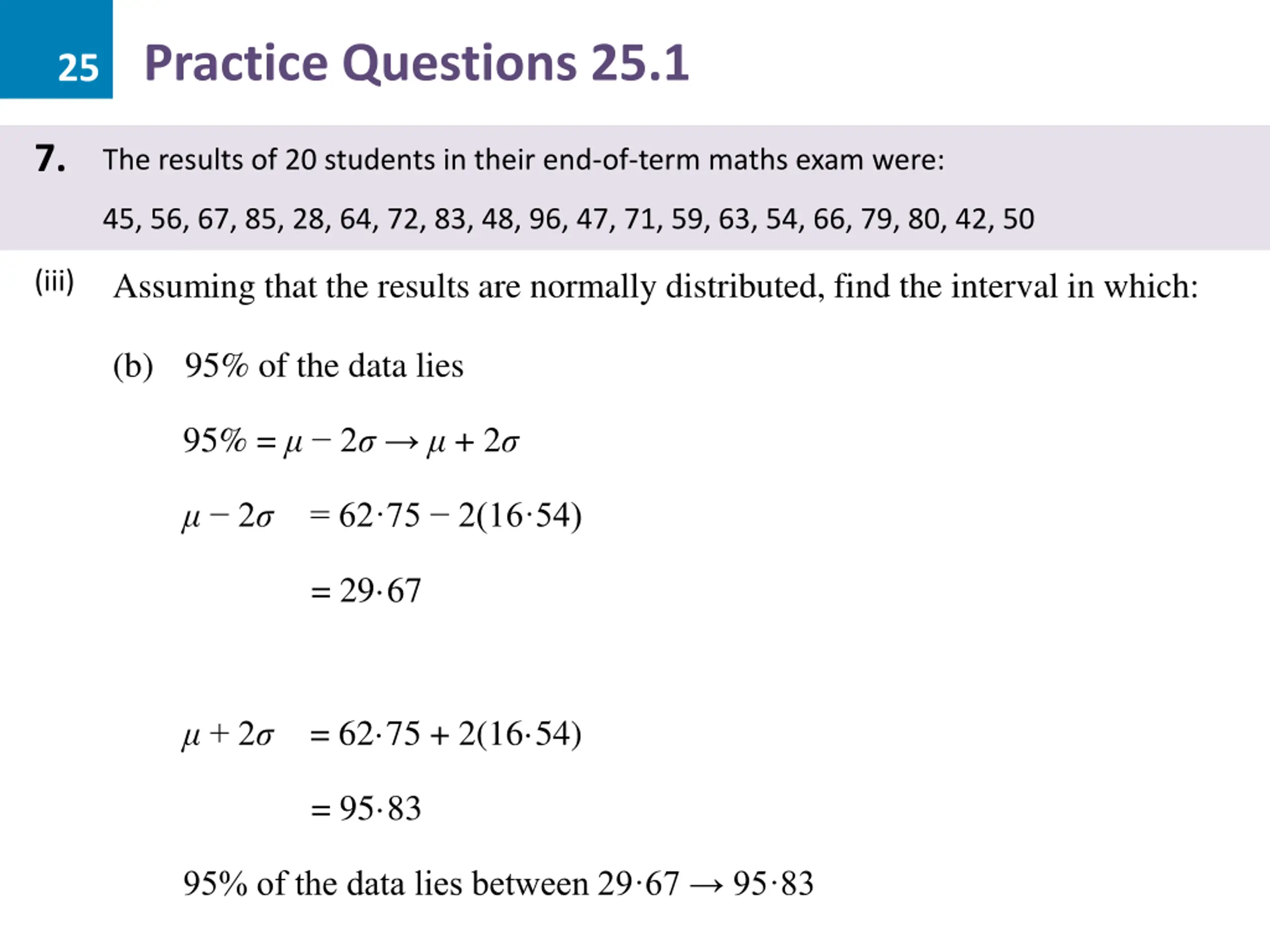 25 Practice Questions 25.1 7. The results of 20 students in their end-of-term maths exam were: 45, 56, 67, 85, 28, 64, 72, 83, 48, 96, 47, 71, 59, 63, 54, 66, 79, 80, 42, 50 Assuming that the results are normally distributed, find the interval in which: (iii) (b) 95% of the data lies 95% = 2 + 2 2 = 62 75 2(16 54) = 29 67 = 62 75 + 2(16 54) + 2 = 95 83 95% of the data lies between 29 67 95 83