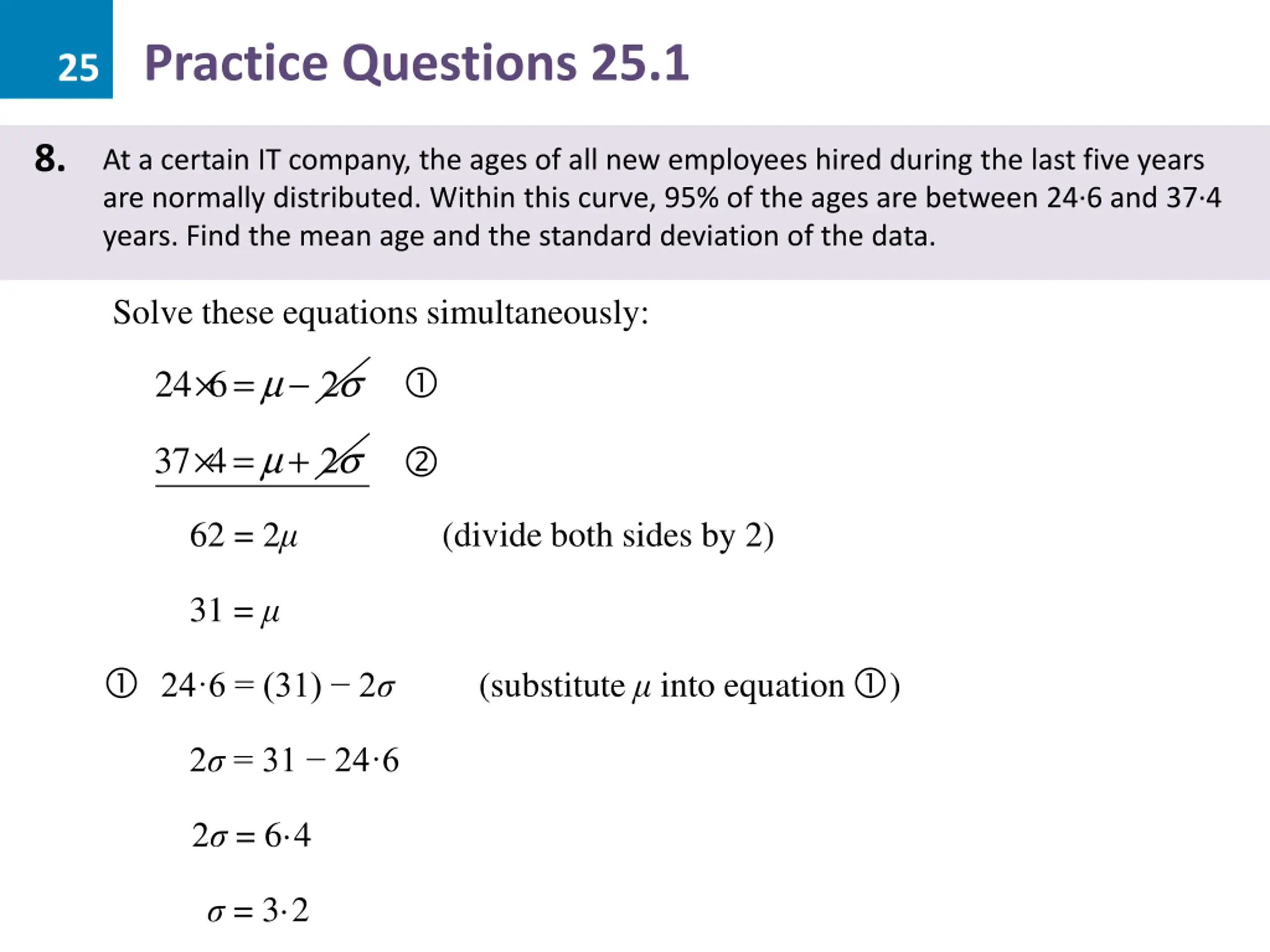 25 Practice Questions 25.1 8. At a certain IT company, the ages of all new employees hired during the last five years are normally distributed. Within this curve, 95% of the ages are between 24 6 and 37 4 years. Find the mean age and the standard deviation of the data. Solve these equations simultaneously: 24 6=m- 2s 37 4=m+ 2s 62 = 2 (divide both sides by 2) 31 = 24 6 = (31) 2 (substitute into equation ) 2 = 31 24 6 2 = 6 4 = 3 2