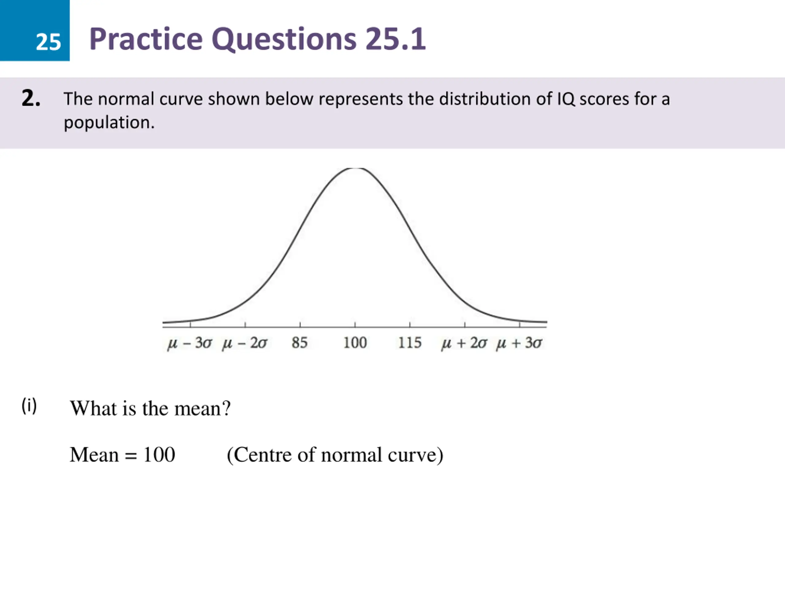 25 Practice Questions 25.1 2. The normal curve shown below represents the distribution of IQ scores for a population. What is the mean? (i) Mean = 100 (Centre of normal curve)