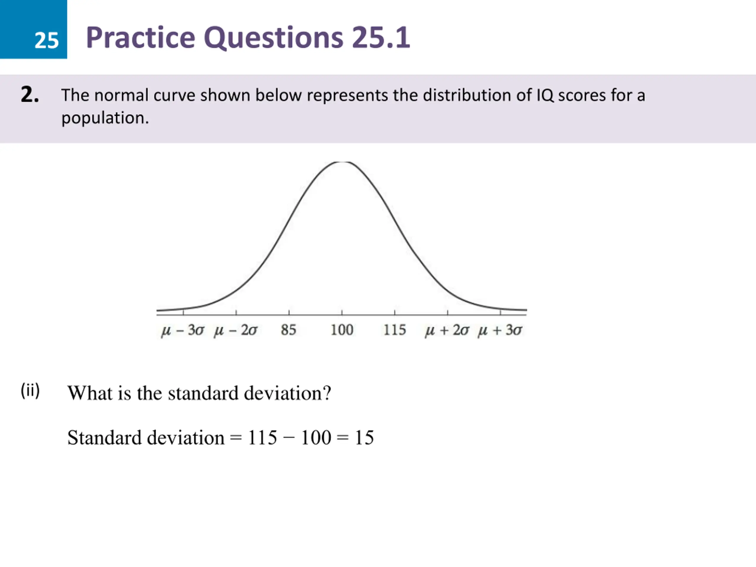 25 Practice Questions 25.1 2. The normal curve shown below represents the distribution of IQ scores for a population. What is the standard deviation? (ii) Standard deviation = 115 100 = 15