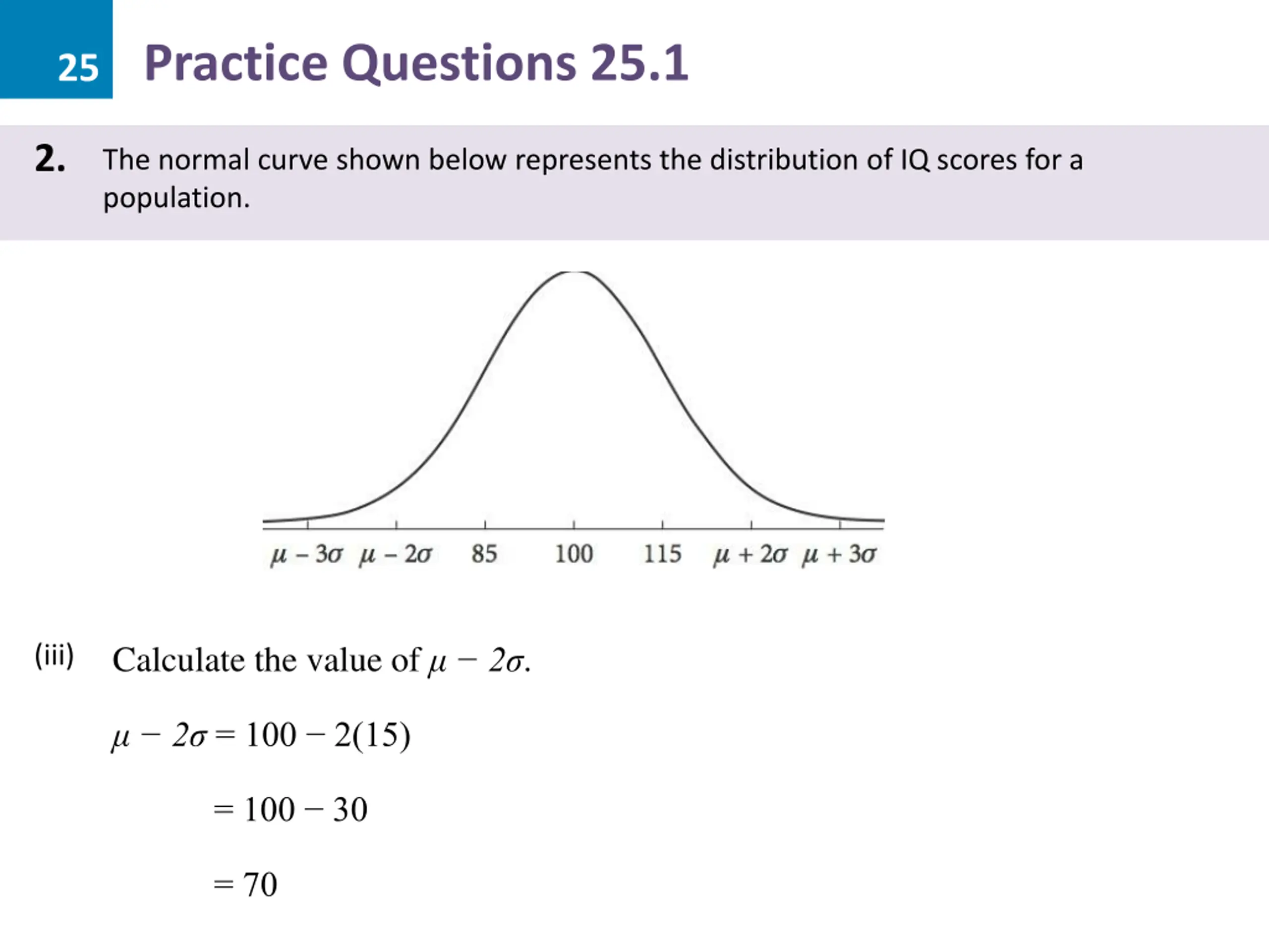 25 Practice Questions 25.1 2. The normal curve shown below represents the distribution of IQ scores for a population. Calculate the value of 2 . (iii) 2 = 100 2(15) = 100 30 = 70
