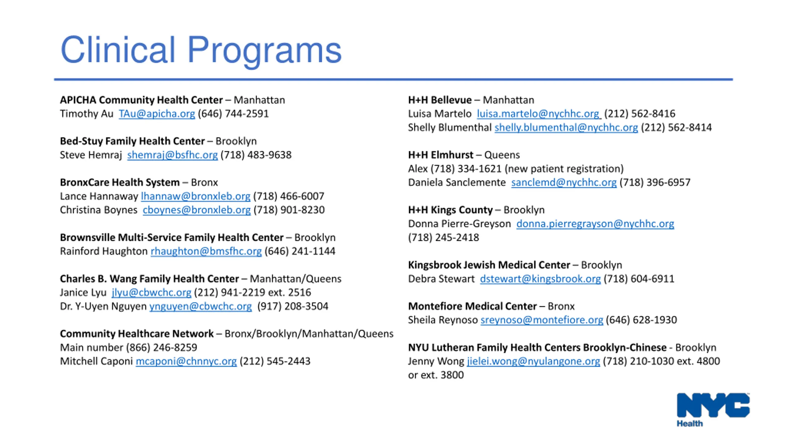 Clinical Programs APICHA Community Health Center Manhattan Timothy Au TAu@apicha.org (646) 744-2591 H+H Bellevue Manhattan Luisa Martelo luisa.martelo@nychhc.org (212) 562-8416 Shelly Blumenthal shelly.blumenthal@nychhc.org (212) 562-8414 Bed-Stuy Family Health Center Brooklyn Steve Hemraj shemraj@bsfhc.org (718) 483-9638 H+H Elmhurst Queens Alex (718) 334-1621 (new patient registration) Daniela Sanclemente sanclemd@nychhc.org (718) 396-6957 BronxCare Health System Bronx Lance Hannaway lhannaw@bronxleb.org (718) 466-6007 Christina Boynes cboynes@bronxleb.org (718) 901-8230 H+H Kings County Brooklyn Donna Pierre-Greyson donna.pierregrayson@nychhc.org (718) 245-2418 Brownsville Multi-Service Family Health Center Brooklyn Rainford Haughton rhaughton@bmsfhc.org (646) 241-1144 Kingsbrook Jewish Medical Center Brooklyn Debra Stewart dstewart@kingsbrook.org (718) 604-6911 Charles B. Wang Family Health Center Manhattan/Queens Janice Lyu jlyu@cbwchc.org (212) 941-2219 ext. 2516 Dr. Y-Uyen Nguyen ynguyen@cbwchc.org (917) 208-3504 Montefiore Medical Center Bronx Sheila Reynoso sreynoso@montefiore.org (646) 628-1930 Community Healthcare Network Bronx/Brooklyn/Manhattan/Queens Main number (866) 246-8259 Mitchell Caponi mcaponi@chnnyc.org (212) 545-2443 NYU Lutheran Family Health Centers Brooklyn-Chinese - Brooklyn Jenny Wong jielei.wong@nyulangone.org (718) 210-1030 ext. 4800 or ext. 3800