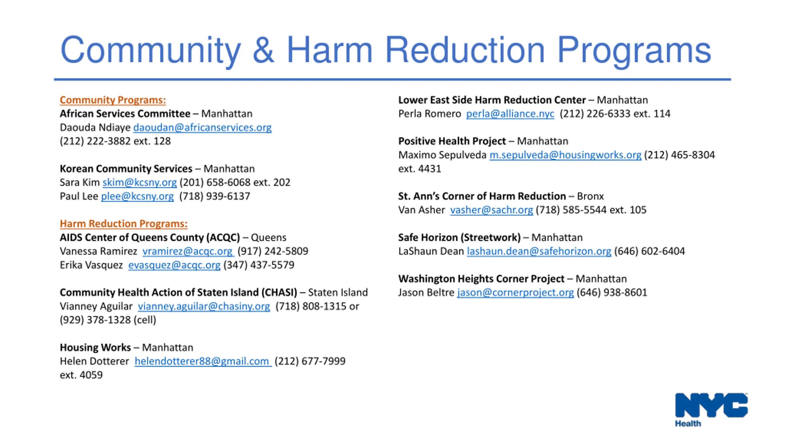 Community & Harm Reduction Programs Community Programs: African Services Committee Manhattan Daouda Ndiaye daoudan@africanservices.org (212) 222-3882 ext. 128 Lower East Side Harm Reduction Center Manhattan Perla Romero perla@alliance.nyc (212) 226-6333 ext. 114 Positive Health Project Manhattan Maximo Sepulveda m.sepulveda@housingworks.org (212) 465-8304 ext. 4431 Korean Community Services Manhattan Sara Kim skim@kcsny.org (201) 658-6068 ext. 202 Paul Lee plee@kcsny.org (718) 939-6137 St. Ann s Corner of Harm Reduction Bronx Van Asher vasher@sachr.org (718) 585-5544 ext. 105 Safe Horizon (Streetwork) Manhattan LaShaun Dean lashaun.dean@safehorizon.org (646) 602-6404 Harm Reduction Programs: AIDS Center of Queens County (ACQC) Queens Vanessa Ramirez vramirez@acqc.org (917) 242-5809 Erika Vasquez evasquez@acqc.org (347) 437-5579 Washington Heights Corner Project Manhattan Jason Beltre jason@cornerproject.org (646) 938-8601 Community Health Action of Staten Island (CHASI) Staten Island Vianney Aguilar vianney.aguilar@chasiny.org (718) 808-1315 or (929) 378-1328 (cell) Housing Works Manhattan Helen Dotterer helendotterer88@gmail.com (212) 677-7999 ext. 4059