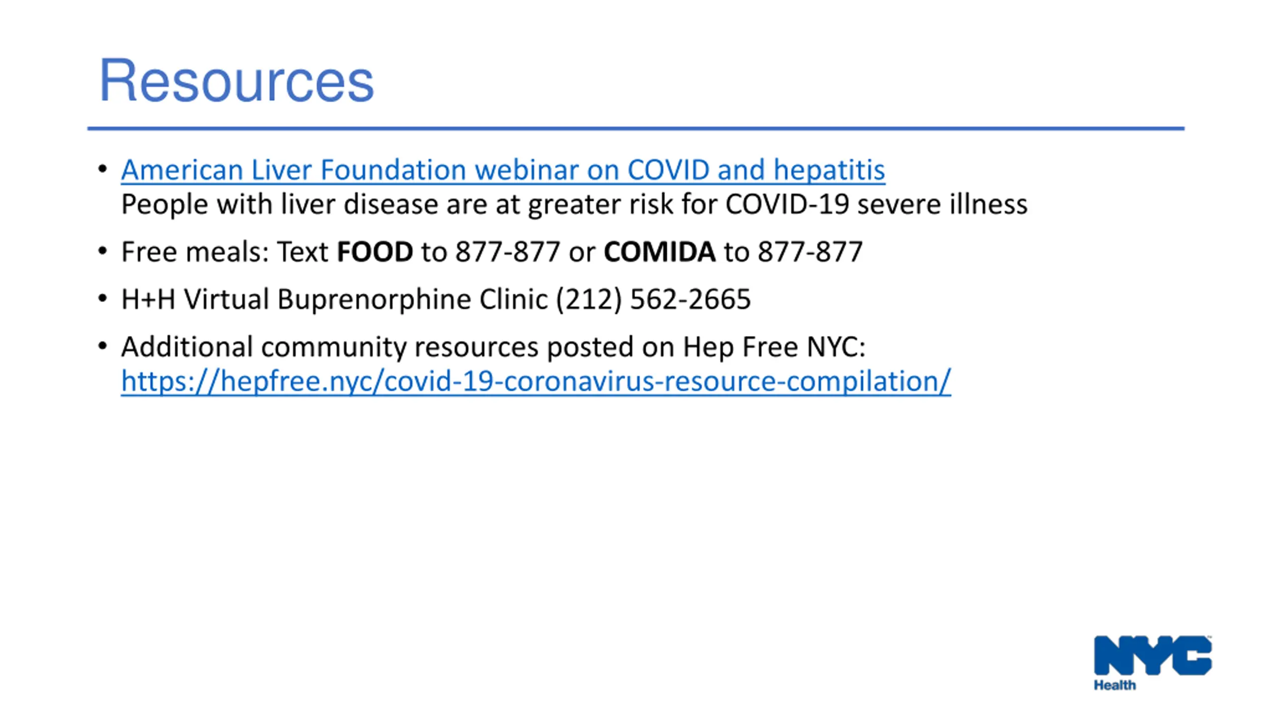 Resources American Liver Foundation webinar on COVID and hepatitis People with liver disease are at greater risk for COVID-19 severe illness Free meals: Text FOOD to 877-877 or COMIDA to 877-877 H+H Virtual Buprenorphine Clinic (212) 562-2665 Additional community resources posted on Hep Free NYC: https://hepfree.nyc/covid-19-coronavirus-resource-compilation/