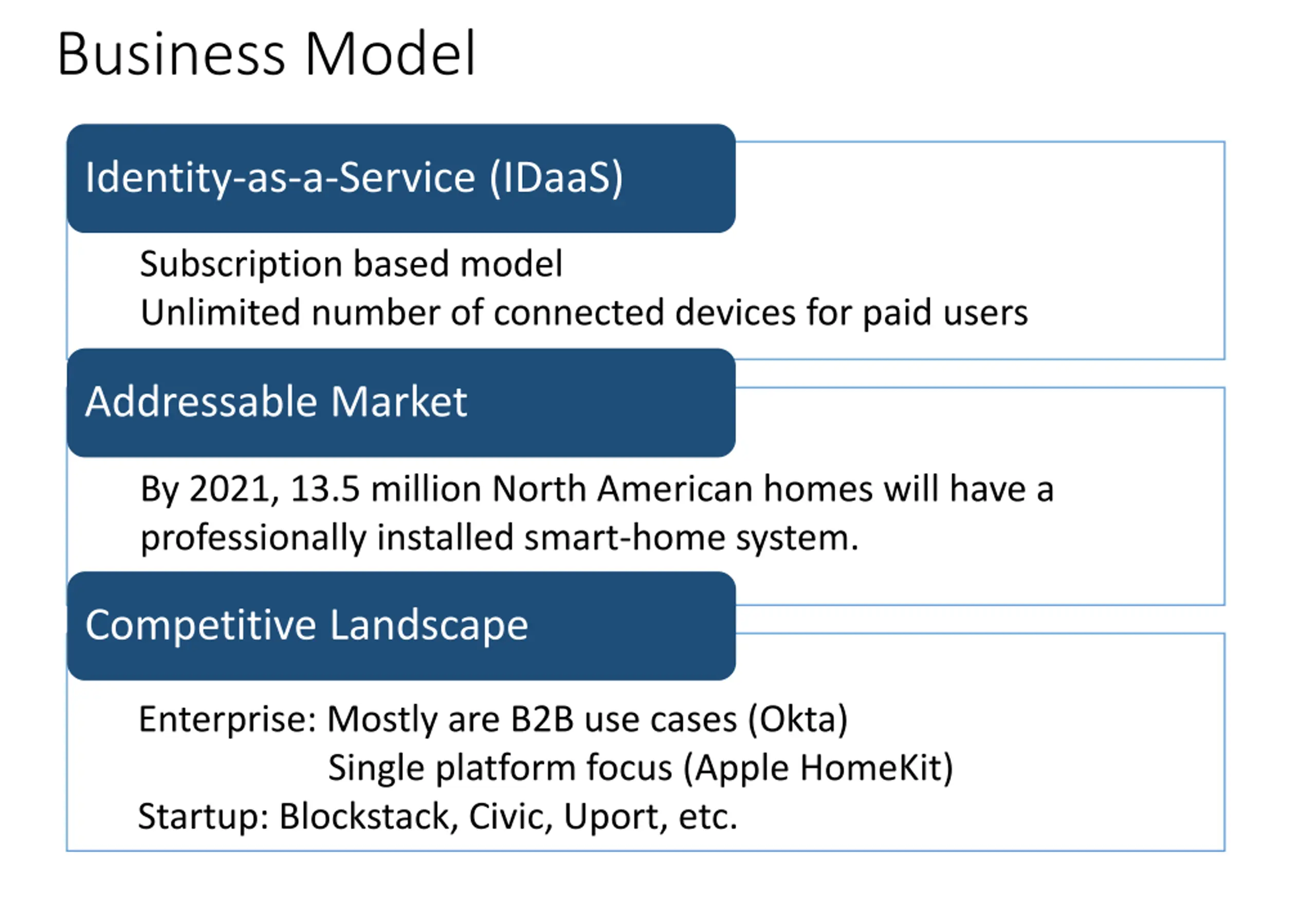 Business Model Identity-as-a-Service (IDaaS) Subscription based model Unlimited number of connected devices for paid users Addressable Market By 2021, 13.5 million North American homes will have a professionally installed smart-home system. Competitive Landscape Enterprise: Mostly are B2B use cases (Okta) Single platform focus (Apple HomeKit) Startup: Blockstack, Civic, Uport, etc.