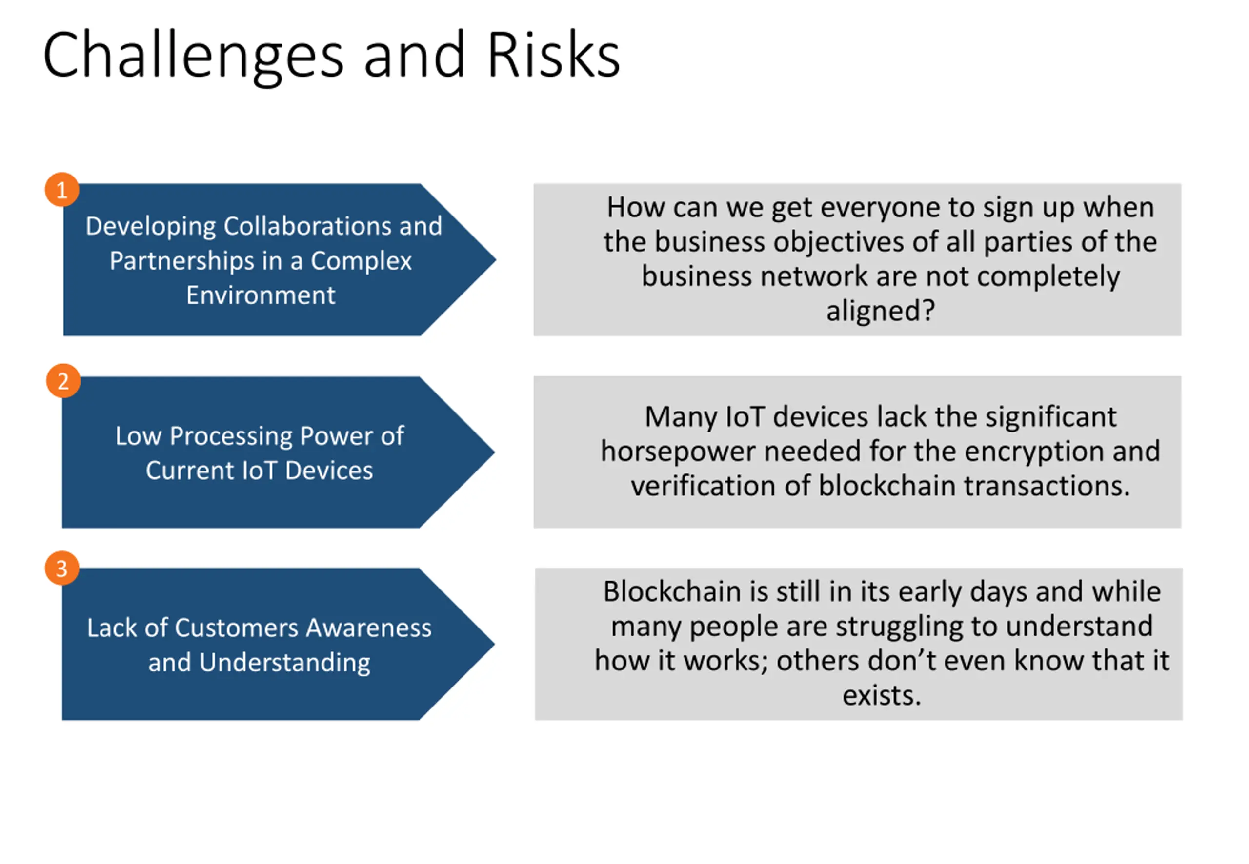 Challenges and Risks 1 How can we get everyone to sign up when the business objectives of all parties of the business network are not completely aligned? Developing Collaborations and Partnerships in a Complex Environment 2 Many IoT devices lack the significant horsepower needed for the encryption and verification of blockchain transactions. Low Processing Power of Current IoT Devices 3 Blockchain is still in its early days and while many people are struggling to understand how it works; others don t even know that it exists. Lack of Customers Awareness and Understanding