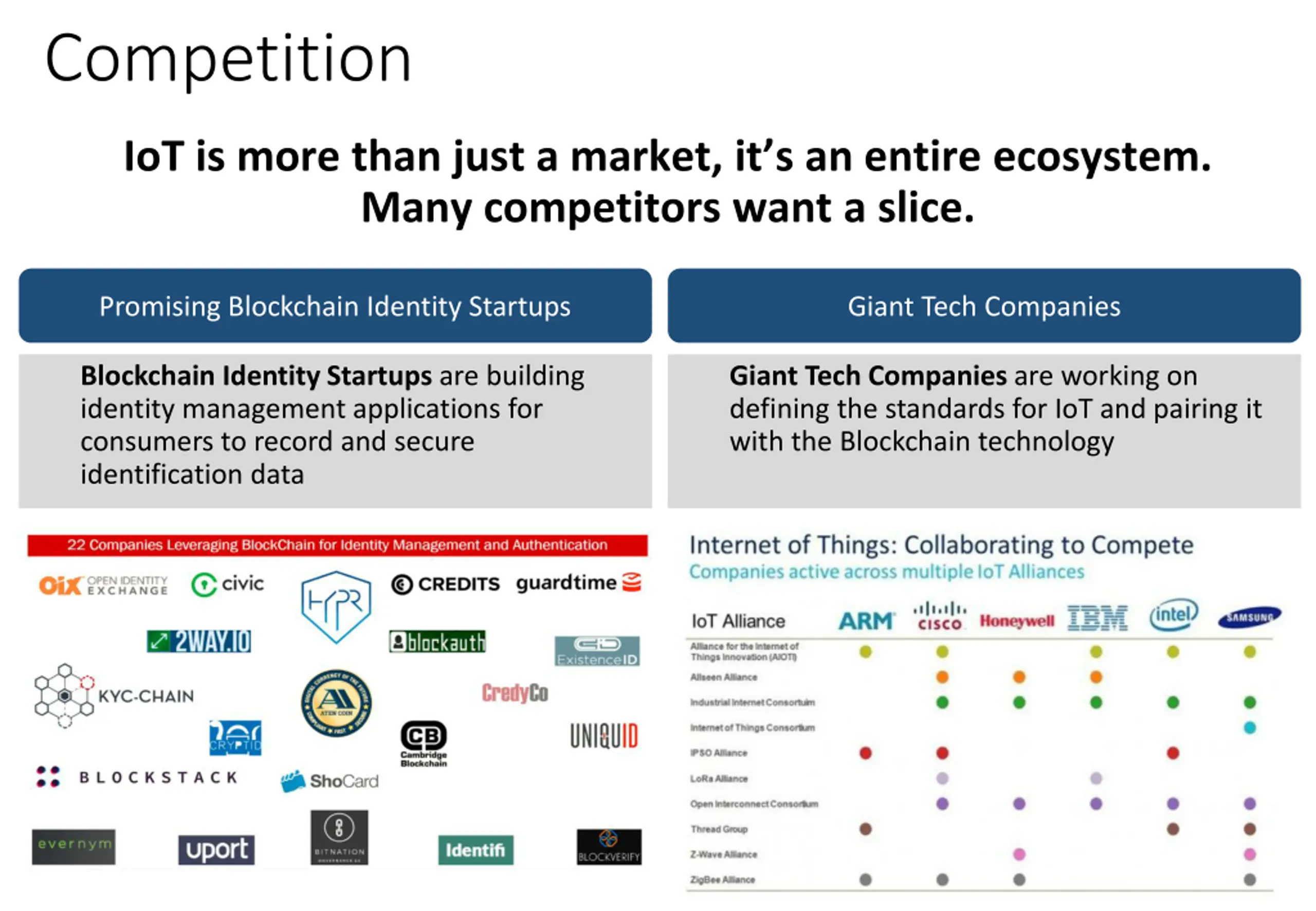 Competition IoT is more than just a market, it s an entire ecosystem. Many competitors want a slice. Promising Blockchain Identity Startups Giant Tech Companies Blockchain Identity Startups arebuilding identity management applications for consumers to record and secure identification data Giant Tech Companies are working on defining the standards for IoT and pairing it with the Blockchain technology 11