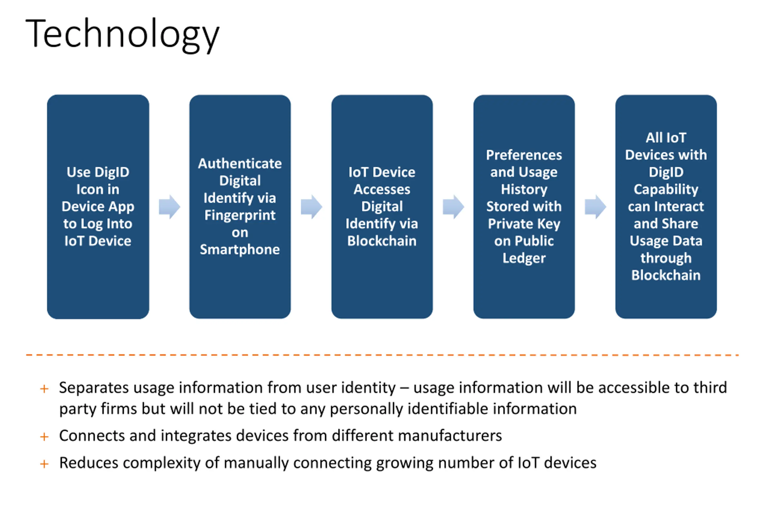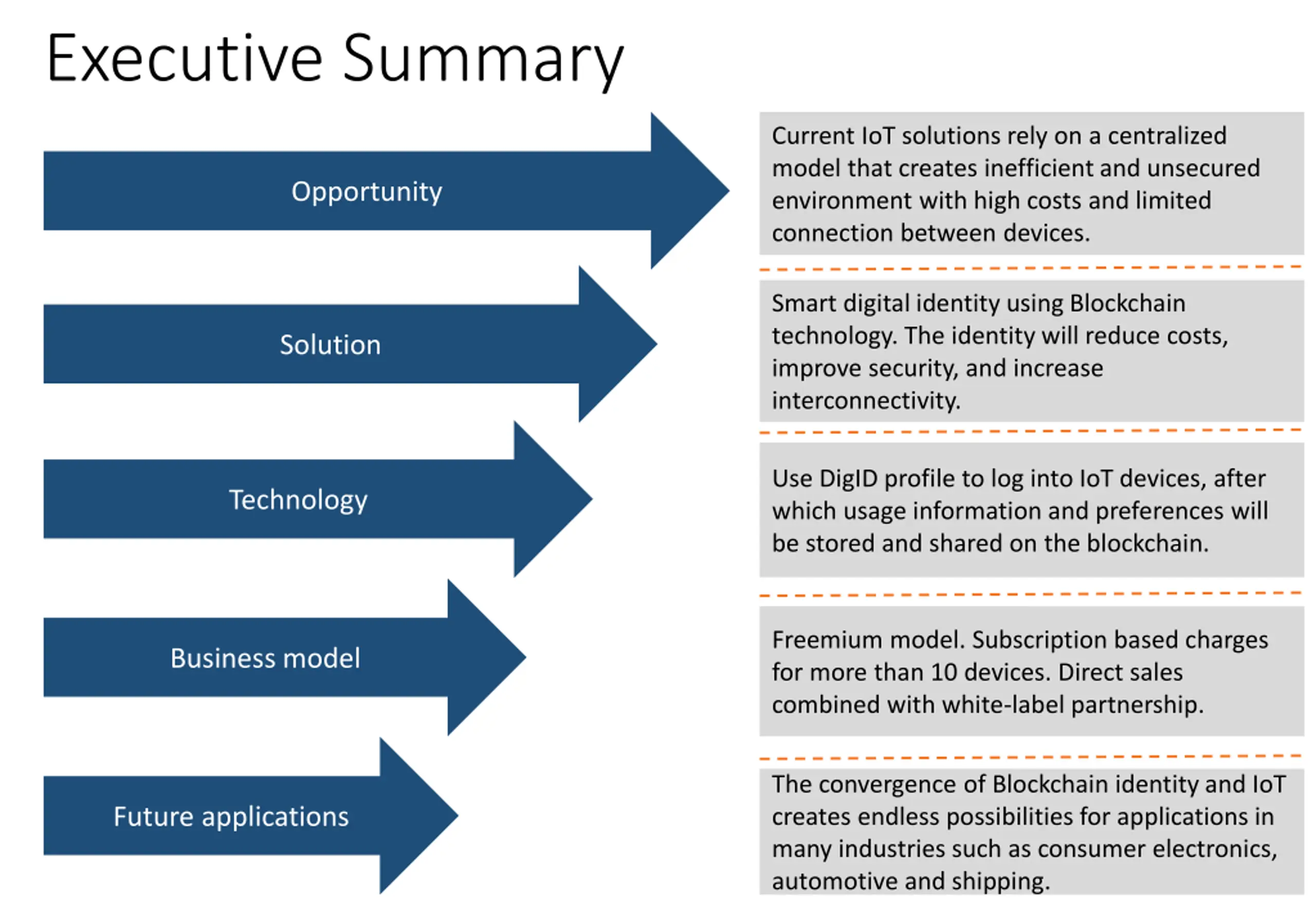 Executive Summary Current IoT solutions rely on a centralized model that creates inefficient and unsecured environment with high costs and limited connection between devices. Opportunity Smart digital identity using Blockchain technology. The identity will reduce costs, improve security, and increase interconnectivity. Solution Use DigID profile to log into IoT devices, after which usage information and preferences will be stored and shared on the blockchain. Technology Freemium model. Subscription based charges for more than 10 devices. Direct sales combined with white-label partnership. Business model The convergence of Blockchain identity and IoT creates endless possibilities for applications in many industries such as consumer electronics, automotive and shipping. Future applications