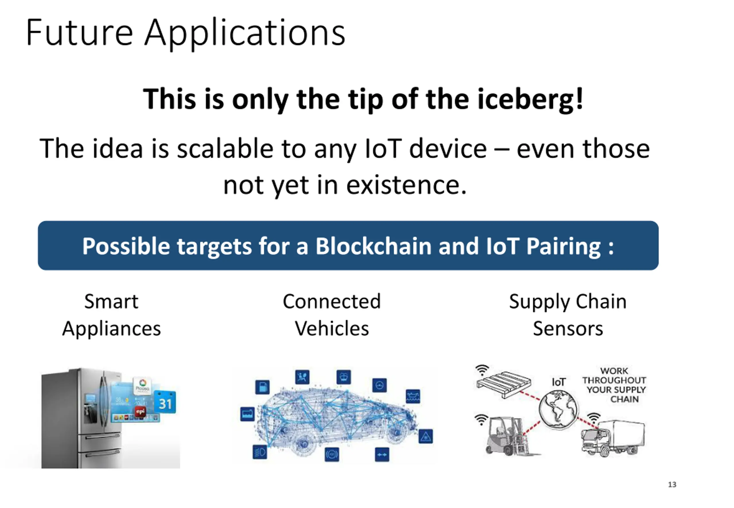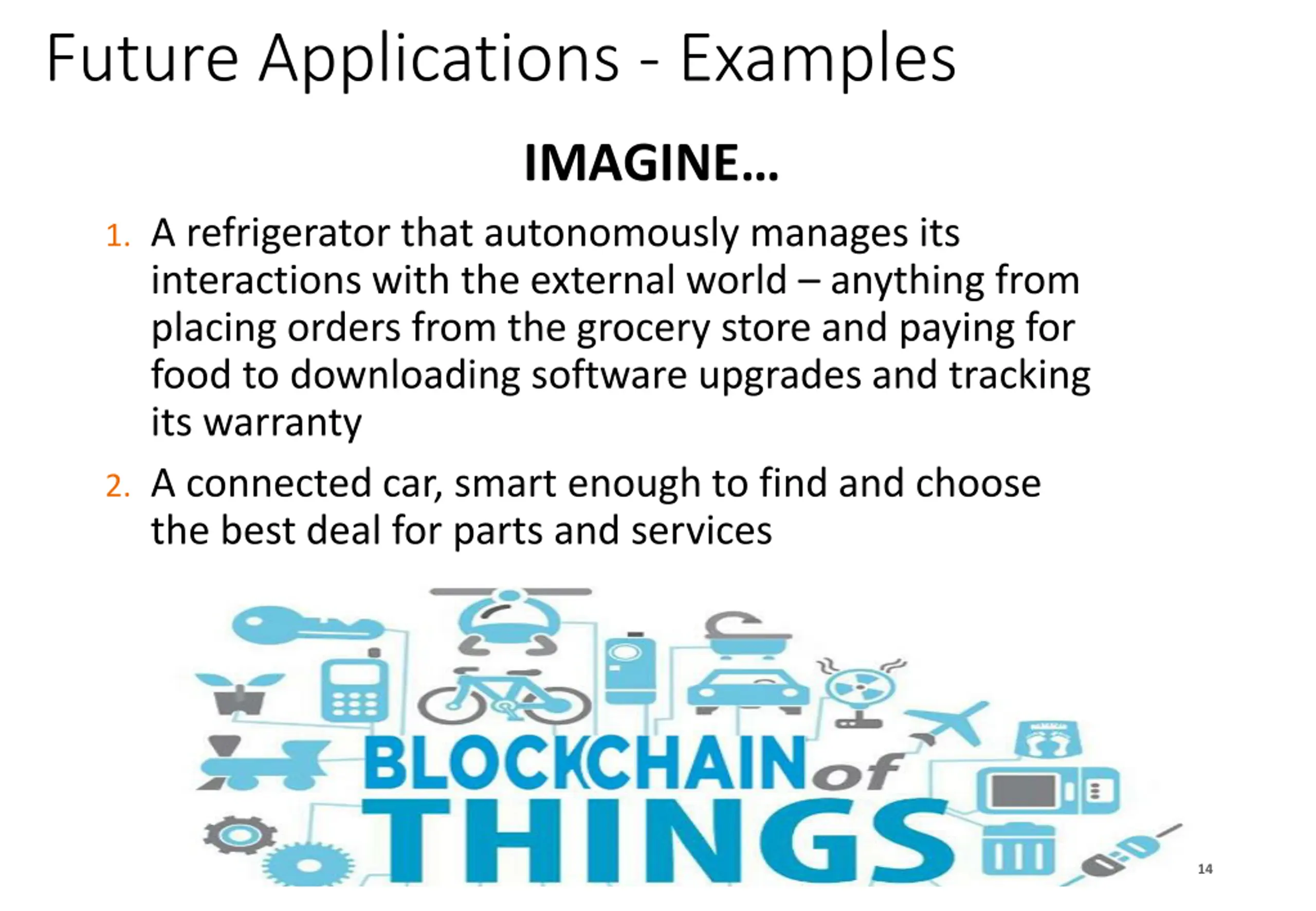 Future Applications This is only the tip of the iceberg! The idea is scalable to any IoT device even those not yet in existence. Possible targets for a Blockchain and IoT Pairing : Smart Appliances Connected Vehicles Supply Chain Sensors 13