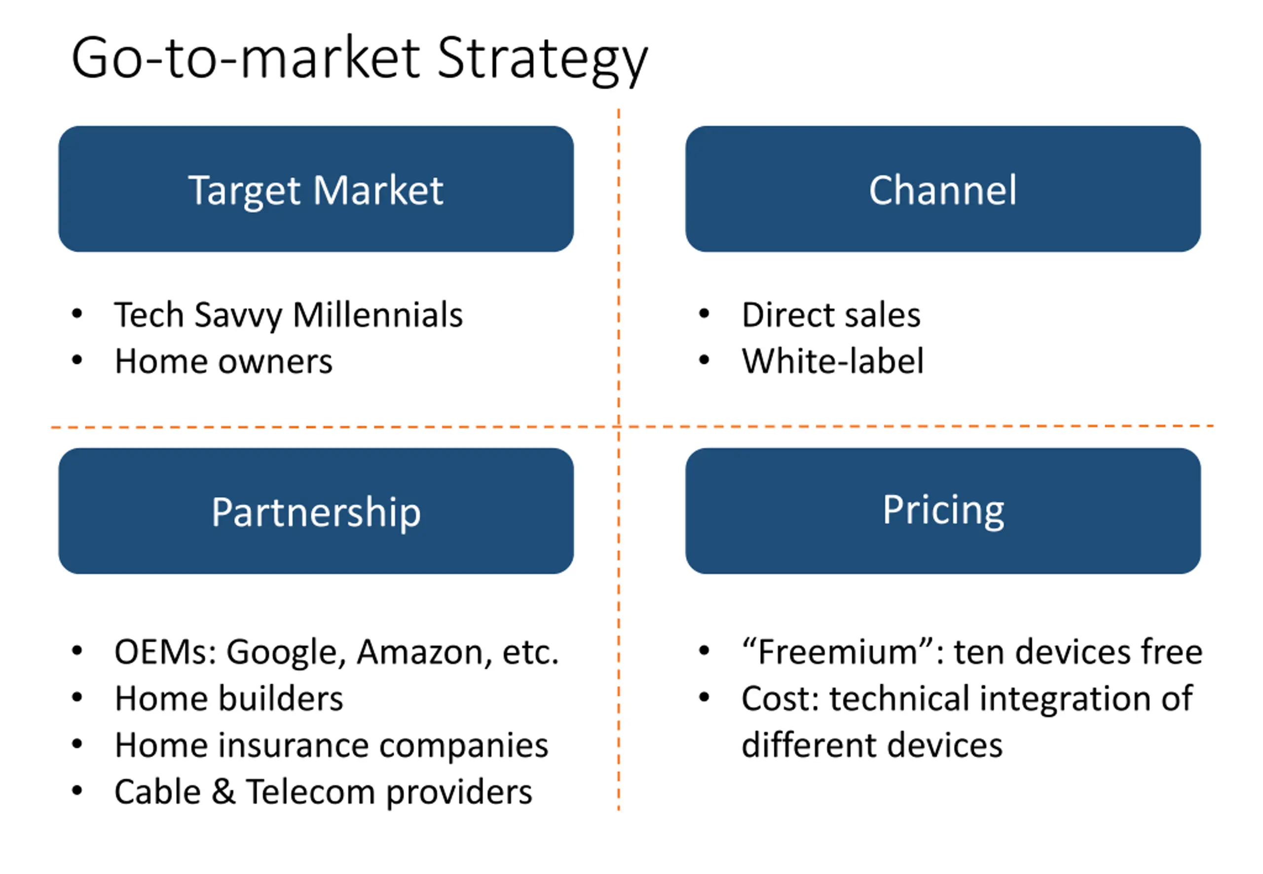 Go-to-market Strategy Target Market Channel Tech Savvy Millennials Home owners Direct sales White-label Pricing Partnership OEMs: Google, Amazon, etc. Home builders Home insurance companies Cable & Telecom providers Freemium : ten devices free Cost: technical integration of different devices