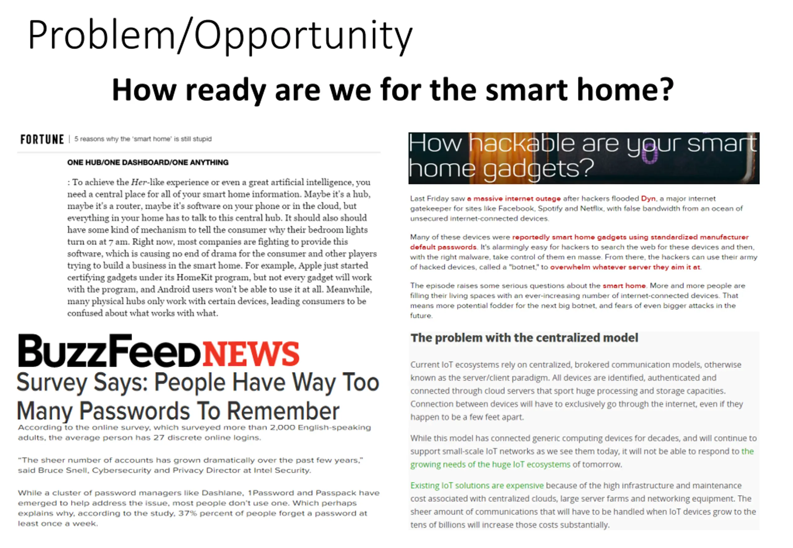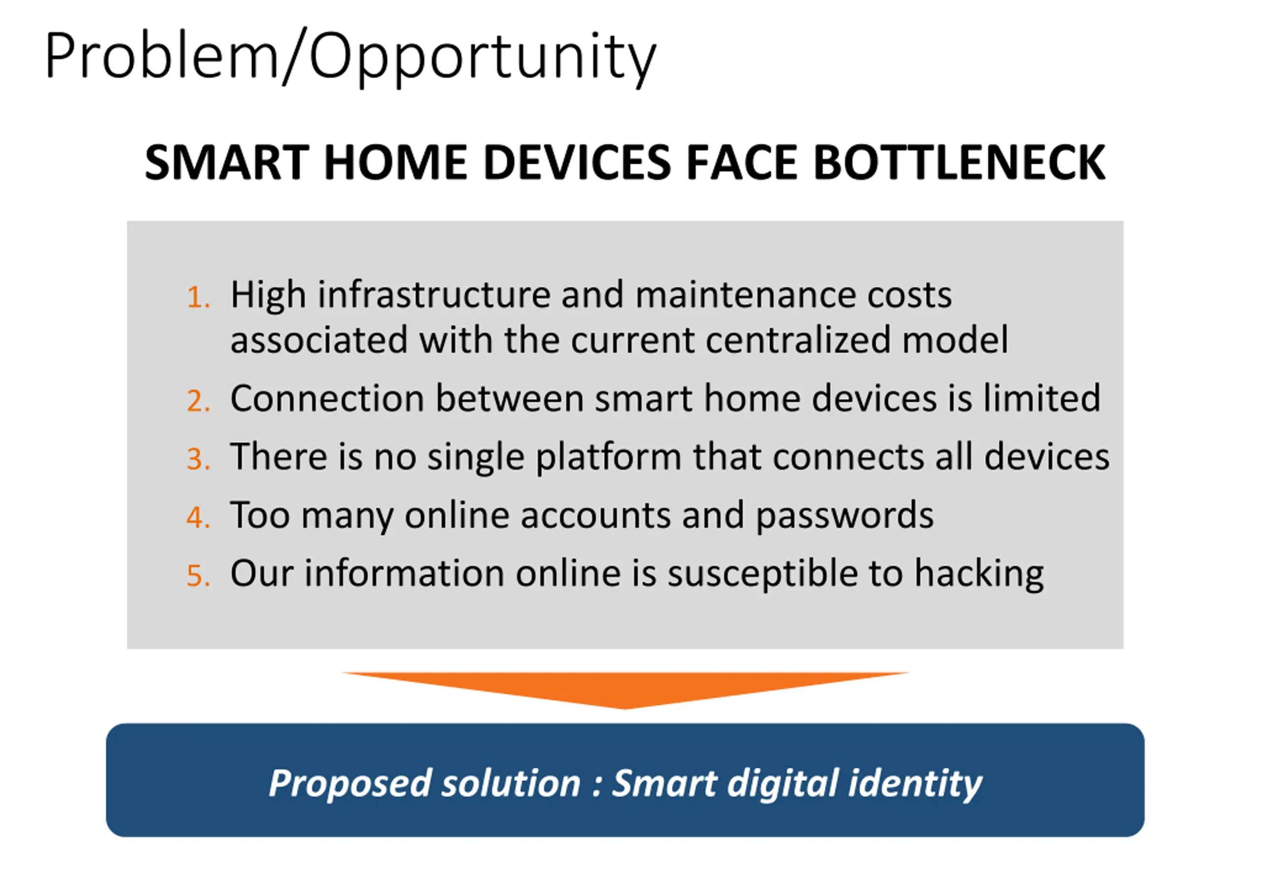 Problem/Opportunity SMART HOME DEVICES FACE BOTTLENECK 1. High infrastructure and maintenance costs associated with the current centralized model 2. Connection between smart home devices is limited 3. There is no single platform that connects all devices 4. Too many online accounts and passwords 5. Our information online is susceptible to hacking Proposed solution : Smart digital identity