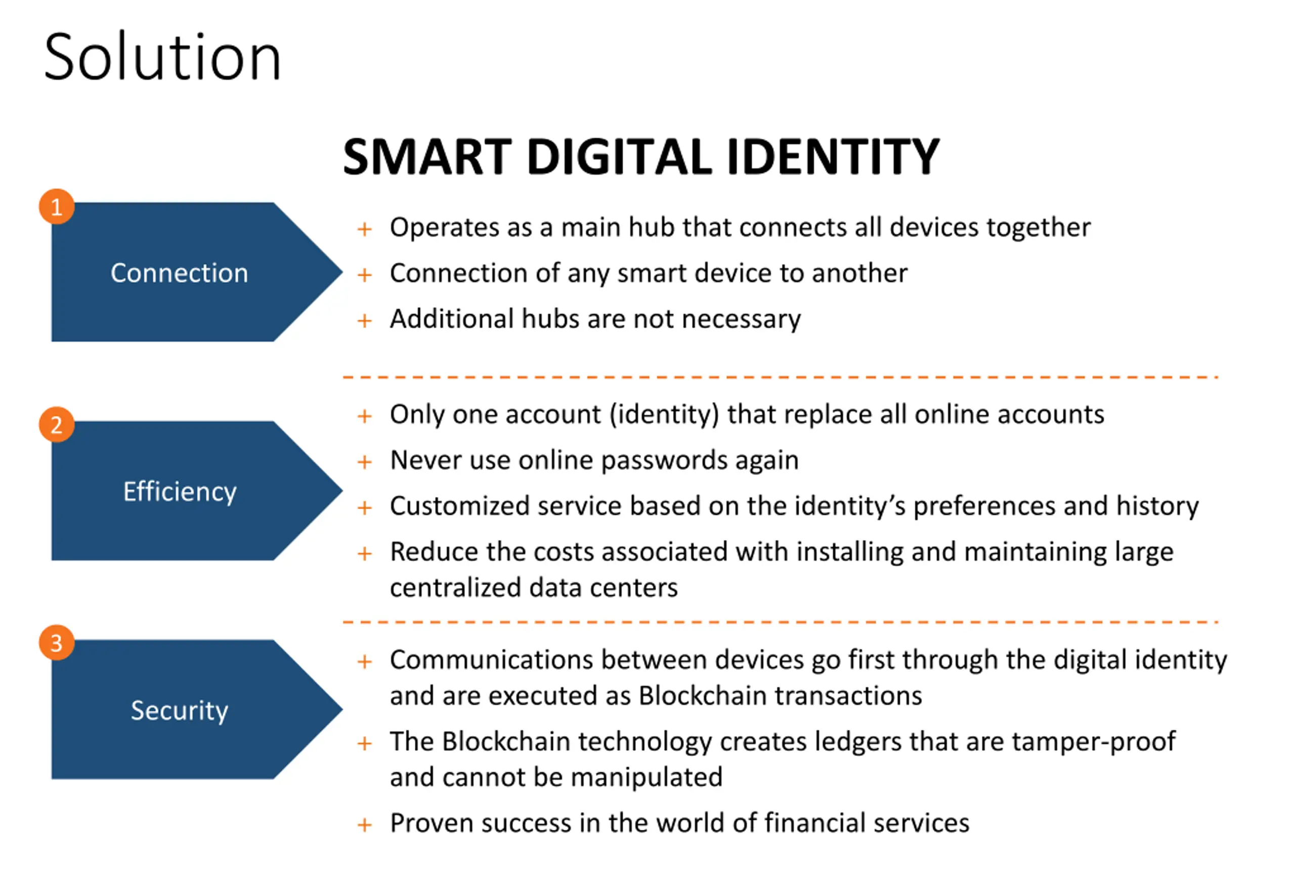Solution SMART DIGITAL IDENTITY 1 + Operates as a main hub that connects all devices together Connection + Connection of any smart device to another + Additional hubs are not necessary + Only one account (identity) that replace all online accounts 2 + Never use online passwords again Efficiency + Customized service based on the identity s preferences and history + Reduce the costs associated with installing and maintaining large centralized data centers 3 + Communications between devices go first through the digital identity and are executed as Blockchain transactions Security + The Blockchain technology creates ledgers that are tamper-proof and cannot be manipulated + Proven success in the world of financial services