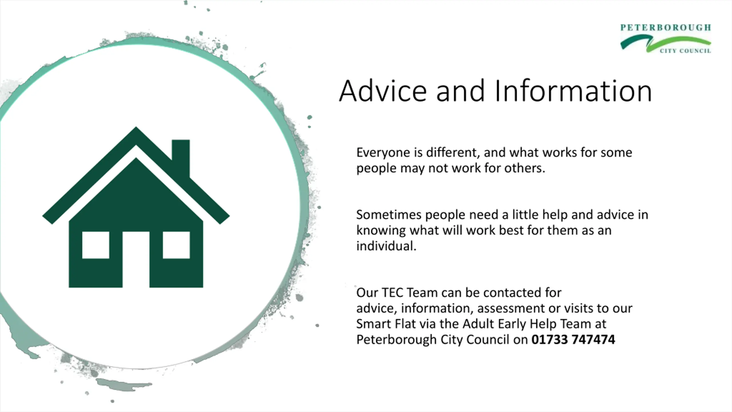 Advice and Information Everyone is different, and what works for some people may not work for others. Sometimes people need a little help and advice in knowing what will work best for them as an individual. Our TEC Team can be contacted for advice, information, assessment or visits to our Smart Flat via the Adult Early Help Team at Peterborough City Council on 01733 747474
