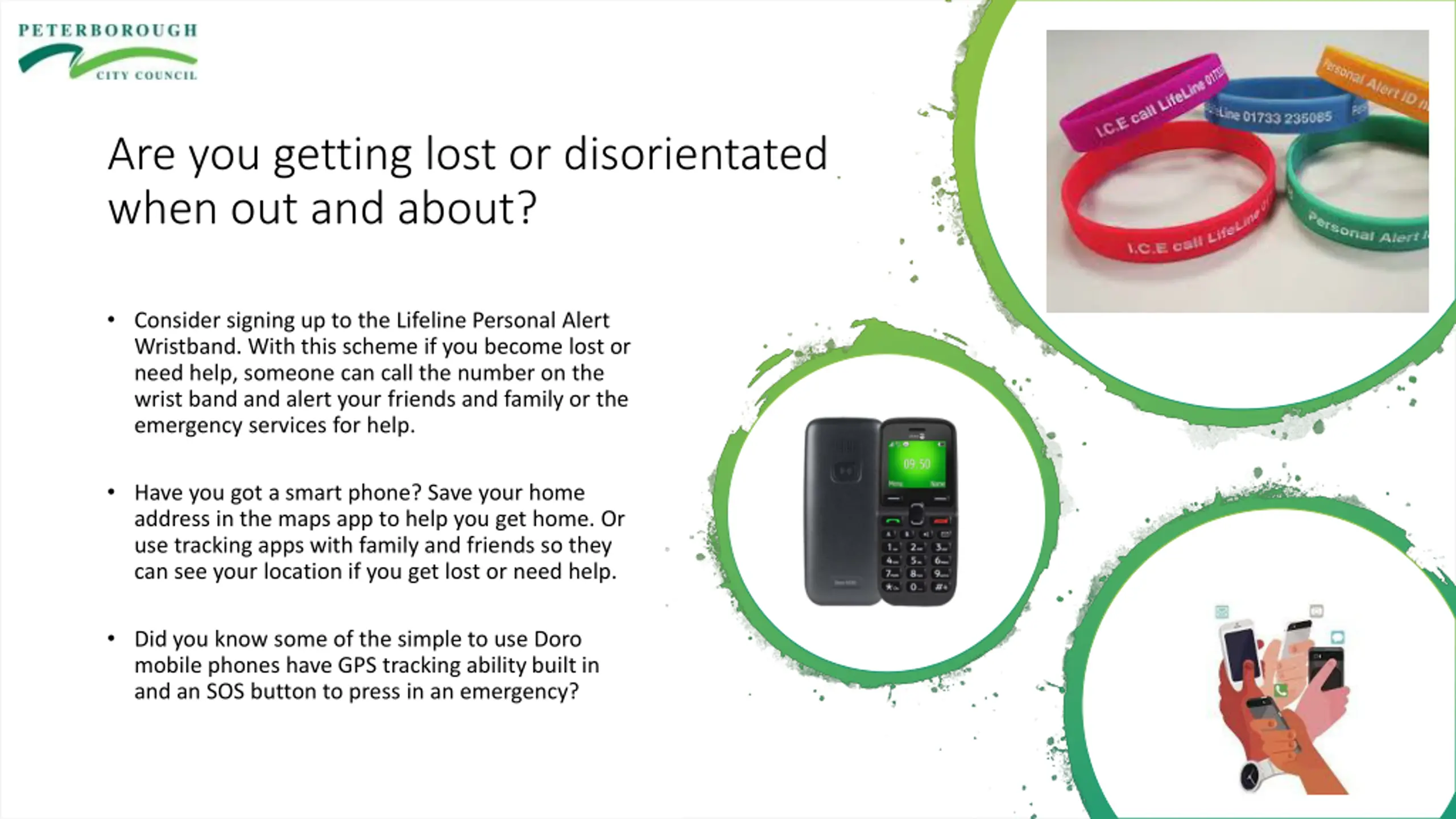 Are you getting lost or disorientated when out and about? Consider signing up to the Lifeline Personal Alert Wristband. With this scheme if you become lost or need help, someone can call the number on the wrist band and alert your friends and family or the emergency services for help. Have you got a smart phone? Save your home address in the maps app to help you get home. Or use tracking apps with family and friends so they can see your location if you get lost or need help. Did you know some of the simple to use Doro mobile phones have GPS tracking ability built in and an SOS button to press in an emergency?
