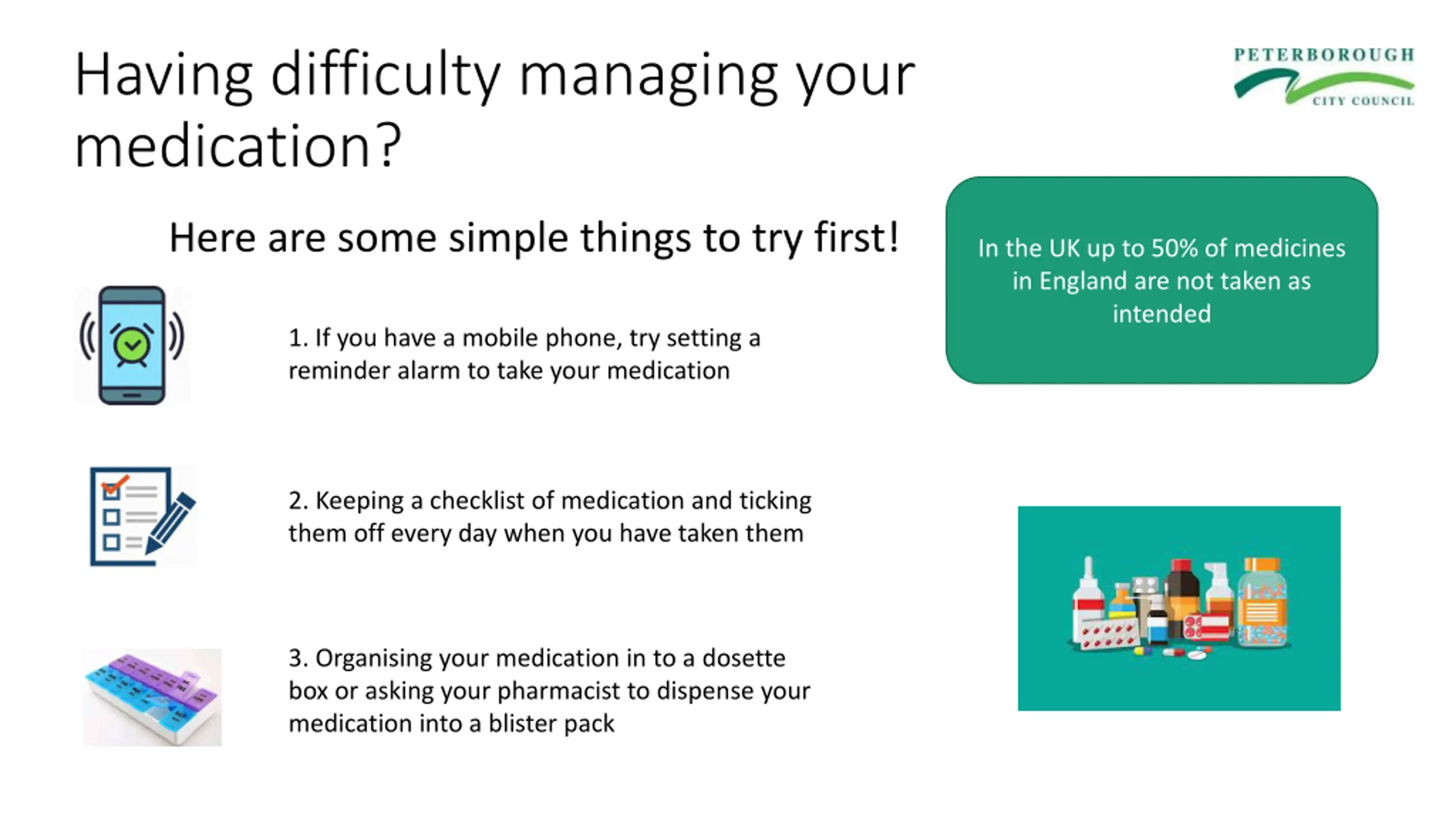 Having difficulty managing your medication? Here are some simple things to try first! In the UK up to 50% of medicines in England are not taken as intended 1. If you have a mobile phone, try setting a reminder alarm to take your medication 2. Keeping a checklist of medication and ticking them off every day when you have taken them 3. Organising your medication in to a dosette box or asking your pharmacist to dispense your medication into a blister pack