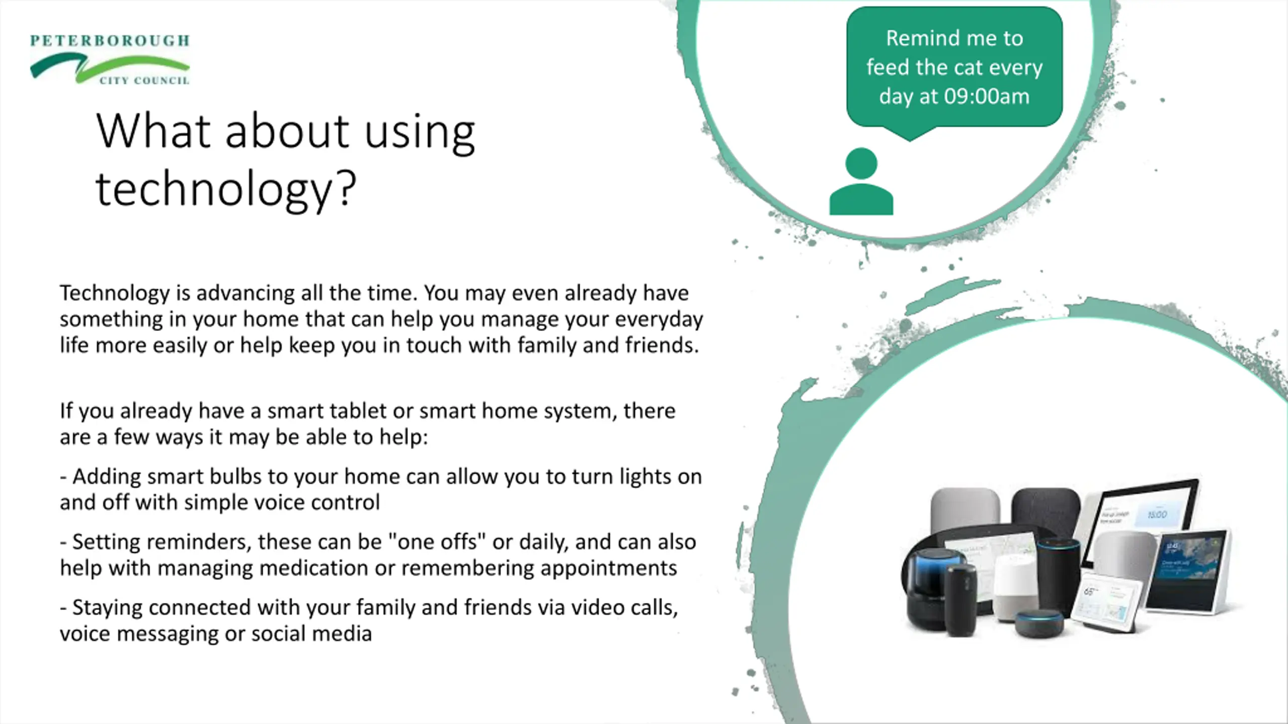 Remind me to feed the cat every day at 09:00am What about using technology? Technology is advancing all the time. You may even already have something in your home that can help you manage your everyday life more easily or help keep you in touch with family and friends. If you already have a smart tablet or smart home system, there are a few ways it may be able to help: - Adding smart bulbs to your home can allow you to turn lights on and off with simple voice control - Setting reminders, these can be "one offs" or daily, and can also help with managing medication or remembering appointments - Staying connected with your family and friends via video calls, voice messaging or social media