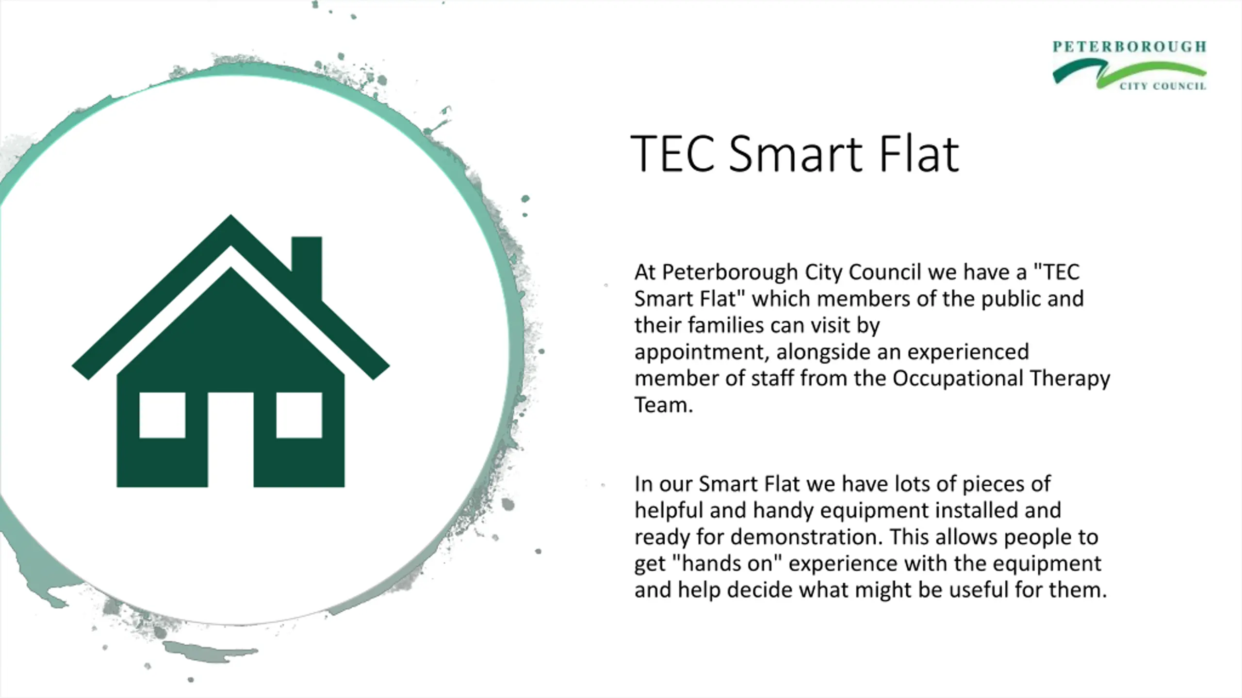 TEC Smart Flat At Peterborough City Council we have a "TEC Smart Flat" which members of the public and their families can visit by appointment, alongside an experienced member of staff from the Occupational Therapy Team. In our Smart Flat we have lots of pieces of helpful and handy equipment installed and ready for demonstration. This allows people to get "hands on" experience with the equipment and help decide what might be useful for them.