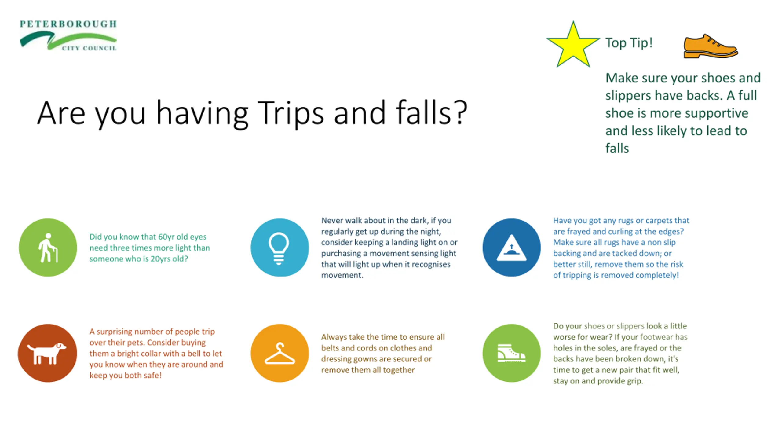 Top Tip! Make sure your shoes and slippers have backs. A full shoe is more supportive and less likely to lead to falls Are you having Trips and falls? Never walk about in the dark, if you regularly get up during the night, consider keeping a landing light on or purchasing a movement sensing light that will light up when it recognises movement. Have you got any rugs or carpets that are frayed and curling at the edges? Make sure all rugs have a non slip backingand are tacked down; or better still, remove them so the risk of tripping is removed completely! Did you know that 60yr old eyes need three times more light than someone who is 20yrs old? Do your shoes or slippers look a little worse for wear? If your footwear has holes in the soles, are frayed or the backs have been broken down,it's time to get a new pair that fit well, stay on and provide grip. A surprising number of people trip over their pets. Consider buying them a bright collar with a bell to let you know when they are around and keep you both safe! Always take the time to ensure all belts and cords on clothes and dressing gowns are secured or remove them all together