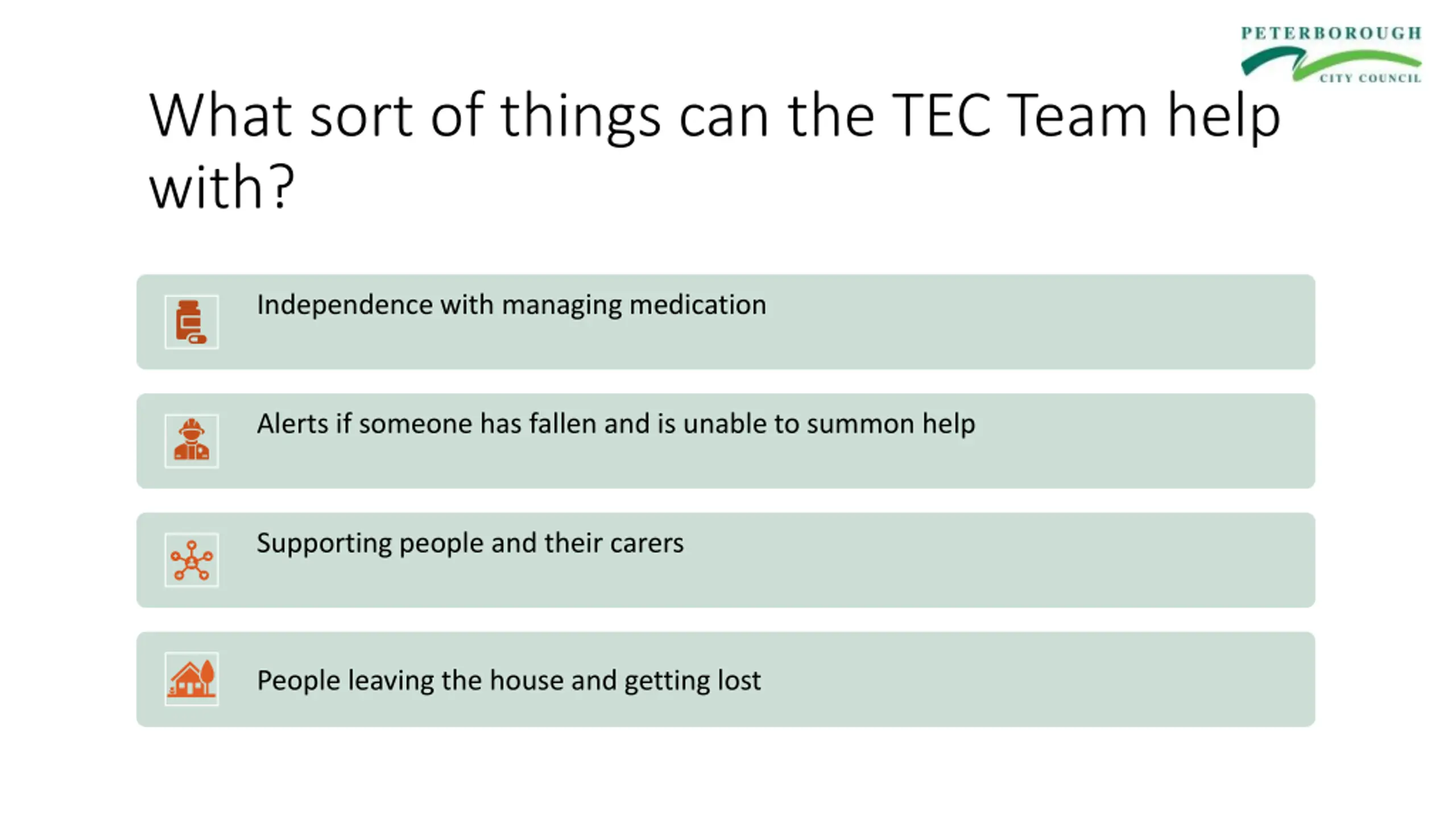 What sort of things can the TEC Team help with? Independence with managing medication Alerts if someone has fallen and is unable to summon help Supporting people and their carers People leaving the house and getting lost