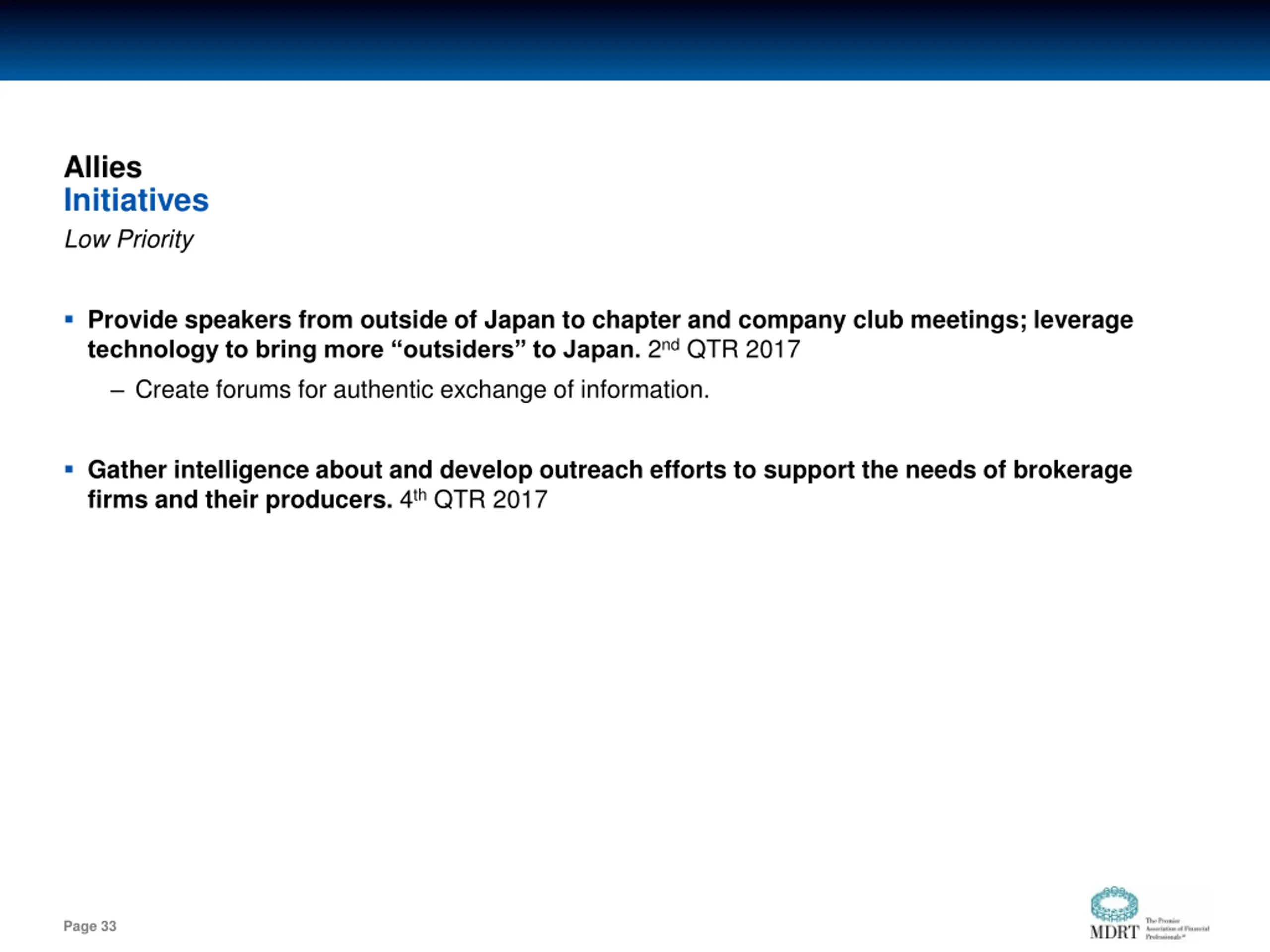 Allies Initiatives Medium Priority Establish a recognition and communications process for company contacts to better connect them to MDRT and the work that they do on members' behalf. 4th QTR 2016 Reexamine MDRT's translation and interpretation policies in light of new strategic focus on Japan. 1st QTR 2017 Low Priority Share the personal growth concept, offer companies content to help teach personal growth. 2nd QTR 2017 Difference between Japanese domestic and MNCs: Develop a more targeted WP concept for domestic companies (to reach COT, TOT Status) vs. MNC (more balanced life). LIMITED ACCESS Page 32