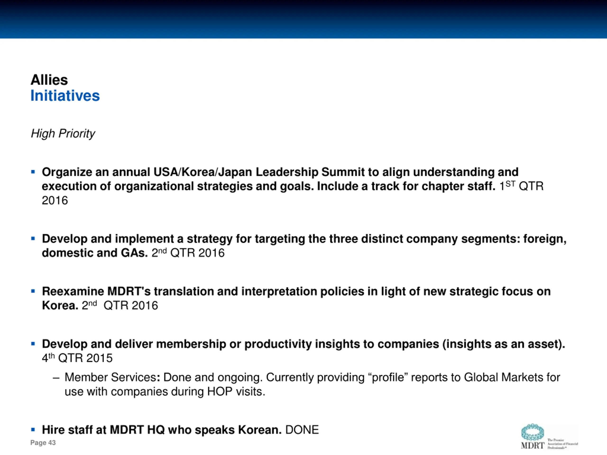 Allies Initiatives High Priority Organize an annual USA/Korea/Japan Leadership Summit to align understanding and execution of organizational strategies and goals. Include a track for chapter staff. 1ST QTR 2016 Develop and implement a strategy for targeting the three distinct company segments: foreign, domestic and GAs. 2nd QTR 2016 Reexamine MDRT's translation and interpretation policies in light of new strategic focus on Korea. 2nd QTR 2016 Develop and deliver membership or productivity insights to companies (insights as an asset). 4th QTR 2015 Member Services: Done and ongoing. Currently providing profile reports to Global Markets for use with companies during HOP visits. Hire staff at MDRT HQ who speaks Korean. DONE LIMITED ACCESS Page 43