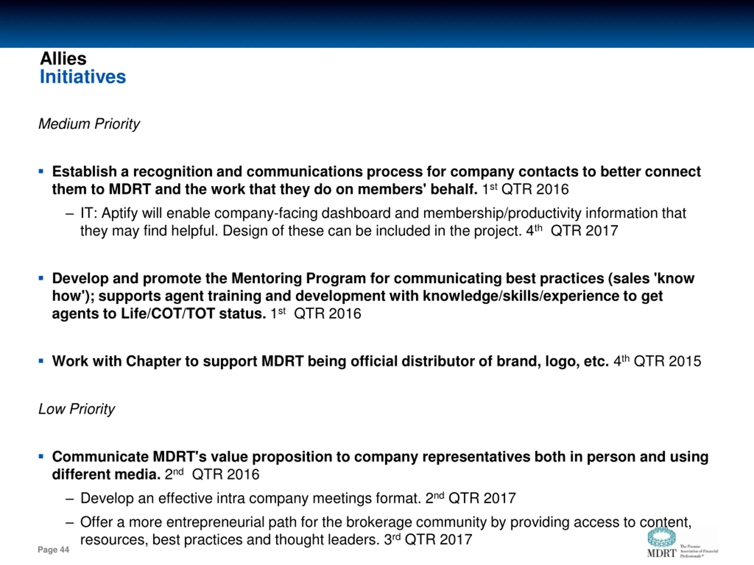 Allies Initiatives Medium Priority Establish a recognition and communications process for company contacts to better connect them to MDRT and the work that they do on members' behalf. 1st QTR 2016 IT: Aptify will enable company-facing dashboard and membership/productivity information that they may find helpful. Design of these can be included in the project. 4th QTR 2017 Develop and promote the Mentoring Program for communicating best practices (sales 'know how'); supports agent training and development with knowledge/skills/experience to get agents to Life/COT/TOT status. 1st QTR 2016 Work with Chapter to support MDRT being official distributor of brand, logo, etc. 4th QTR 2015 Low Priority Communicate MDRT's value proposition to company representatives both in person and using different media. 2nd QTR 2016 Develop an effective intra company meetings format. 2nd QTR 2017 Offer a more entrepreneurial path for the brokerage community by providing access to content, resources, best practices and thought leaders. 3rd QTR 2017 LIMITED ACCESS Page 44