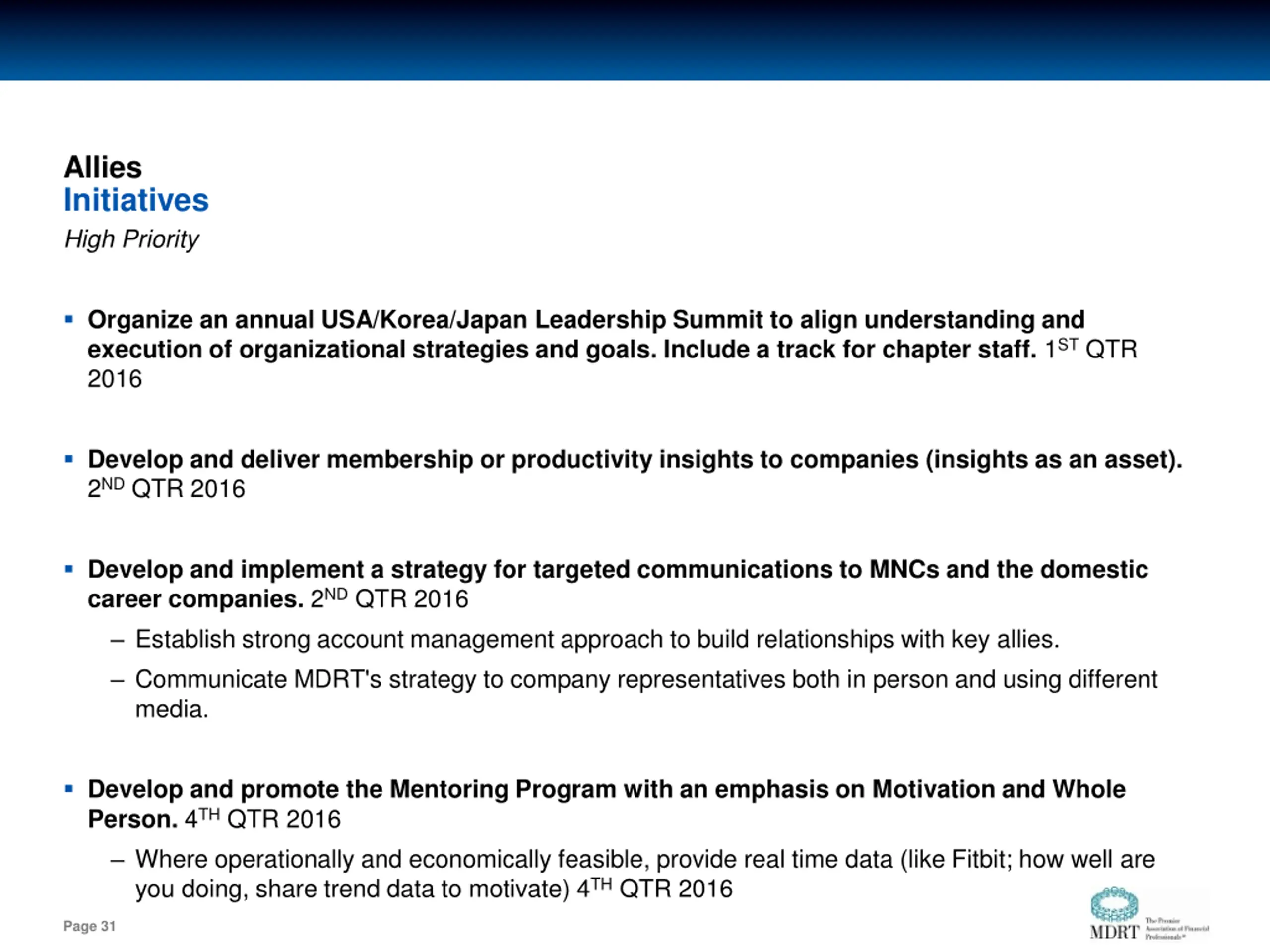 Allies Initiatives High Priority Organize an annual USA/Korea/Japan Leadership Summit to align understanding and execution of organizational strategies and goals. Include a track for chapter staff. 1ST QTR 2016 Develop and deliver membership or productivity insights to companies (insights as an asset). 2ND QTR 2016 Develop and implement a strategy for targeted communications to MNCs and the domestic career companies. 2ND QTR 2016 Establish strong account management approach to build relationships with key allies. Communicate MDRT's strategy to company representatives both in person and using different media. Develop and promote the Mentoring Program with an emphasis on Motivation and Whole Person. 4TH QTR 2016 Where operationally and economically feasible, provide real time data (like Fitbit; how well are you doing, share trend data to motivate) 4TH QTR 2016 LIMITED ACCESS Page 31