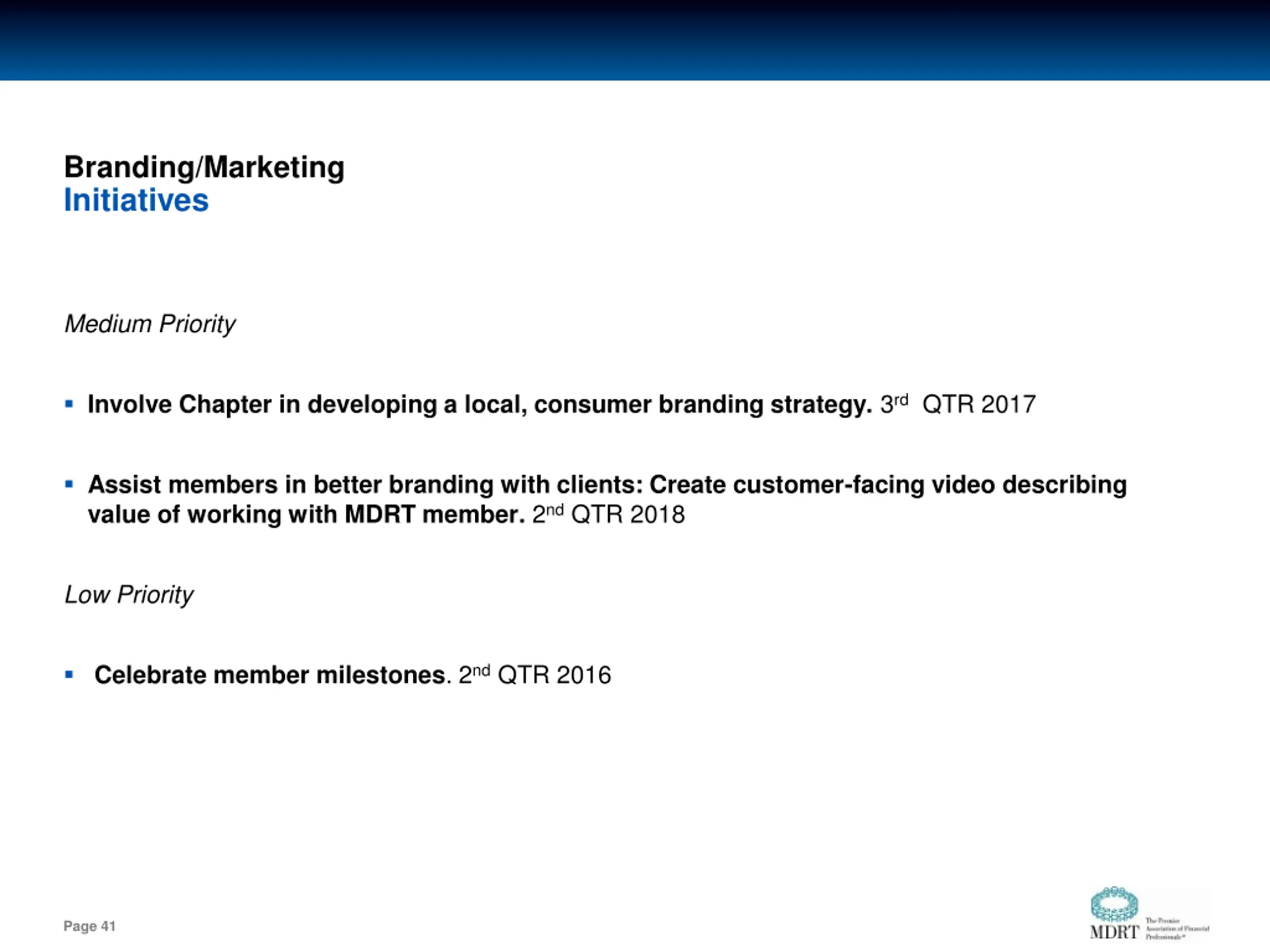 Branding/Marketing Initiatives Medium Priority Involve Chapter in developing a local, consumer branding strategy. 3rd QTR 2017 Assist members in better branding with clients: Create customer-facing video describing value of working with MDRT member. 2nd QTR 2018 Low Priority Celebrate member milestones. 2nd QTR 2016 LIMITED ACCESS Page 41