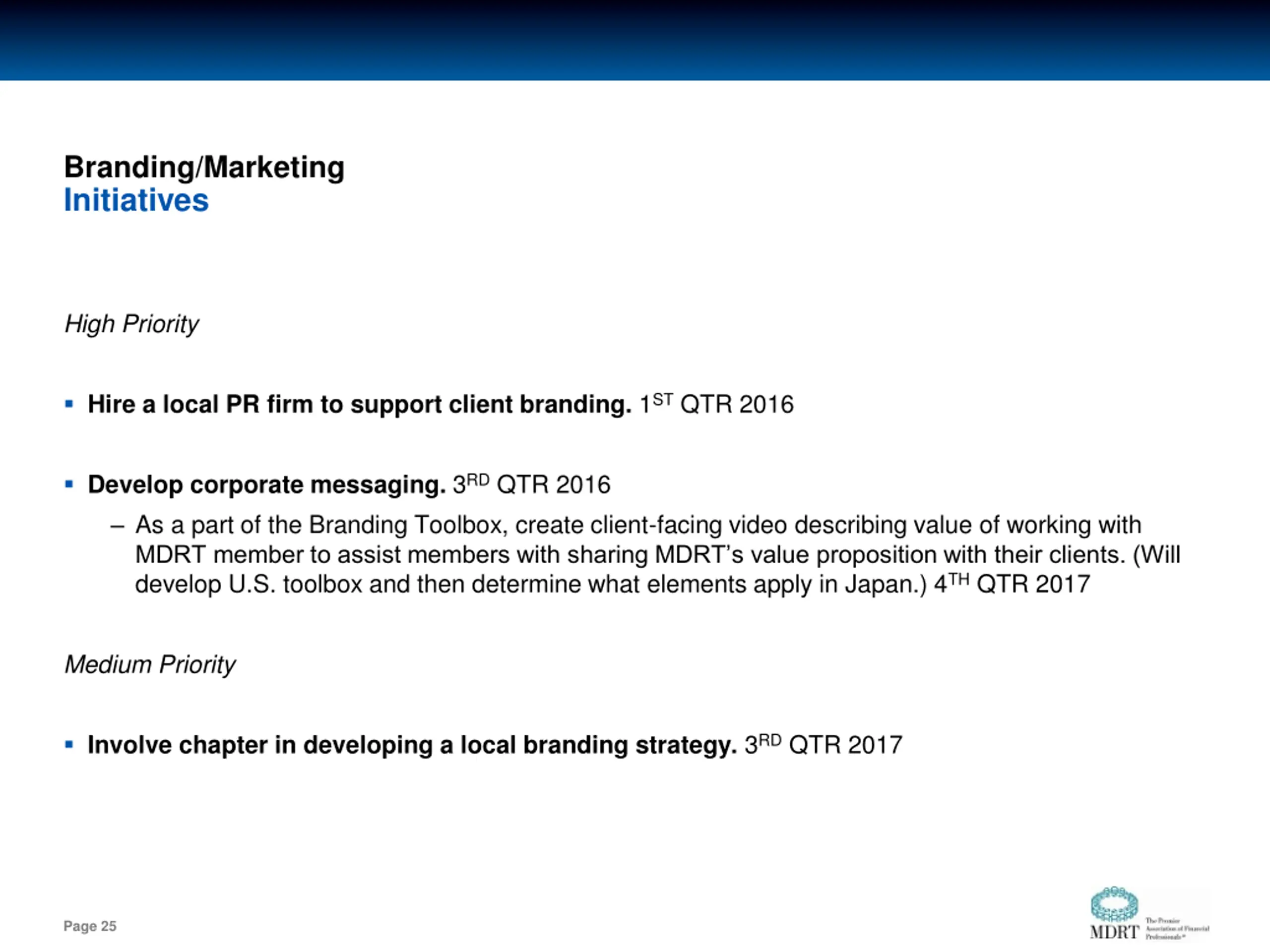 Branding/Marketing Initiatives High Priority Hire a local PR firm to support client branding. 1ST QTR 2016 Develop corporate messaging. 3RD QTR 2016 As a part of the Branding Toolbox, create client-facing video describing value of working with MDRT member to assist members with sharing MDRT s value proposition with their clients. (Will develop U.S. toolbox and then determine what elements apply in Japan.) 4TH QTR 2017 Medium Priority Involve chapter in developing a local branding strategy. 3RD QTR 2017 LIMITED ACCESS Page 25