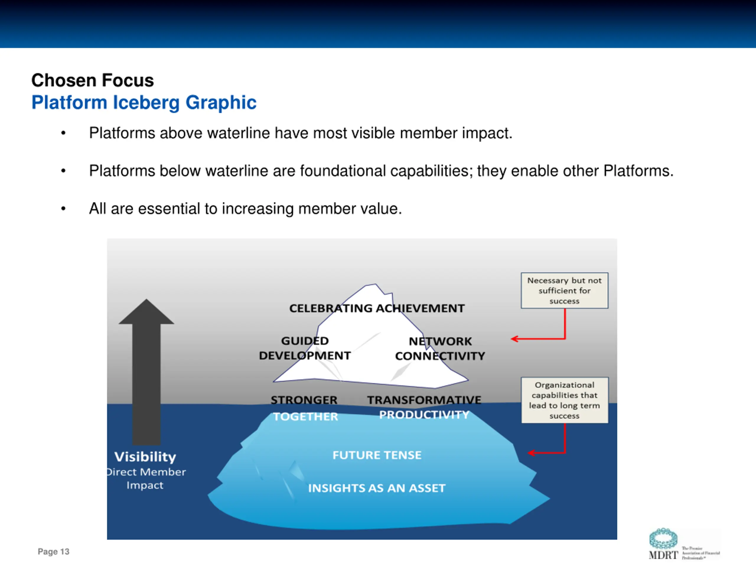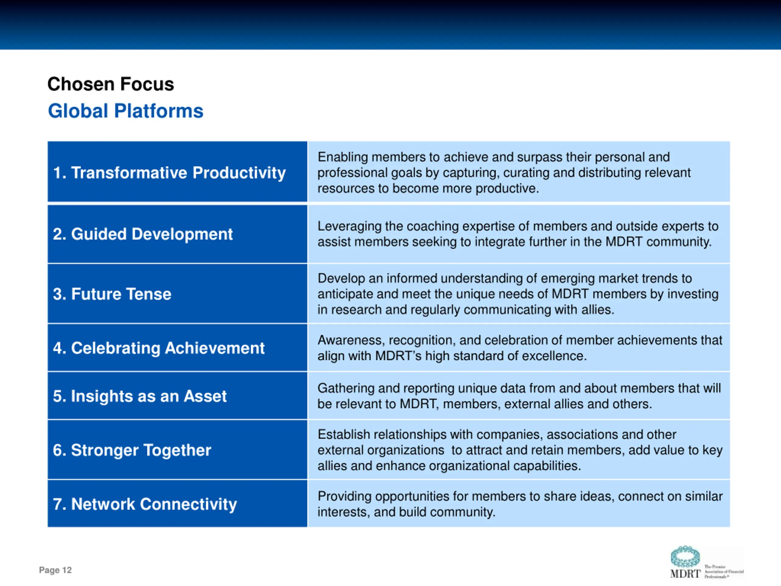 Chosen Focus Global Platforms Enabling members to achieve and surpass their personal and professional goals by capturing, curating and distributing relevant resources to become more productive. 1. Transformative Productivity Leveraging the coaching expertise of members and outside experts to assist members seeking to integrate further in the MDRT community. 2. Guided Development Develop an informed understanding of emerging market trends to anticipate and meet the unique needs of MDRT members by investing in research and regularly communicating with allies. 3. Future Tense Awareness, recognition, and celebration of member achievements that align with MDRT s high standard of excellence. 4. Celebrating Achievement Gathering and reporting unique data from and about members that will be relevant to MDRT, members, external allies and others. 5. Insights as an Asset Establish relationships with companies, associations and other external organizations to attract and retain members, add value to key allies and enhance organizational capabilities. 6. Stronger Together Providing opportunities for members to share ideas, connect on similar interests, and build community. 7. Network Connectivity LIMITED ACCESS Page 12