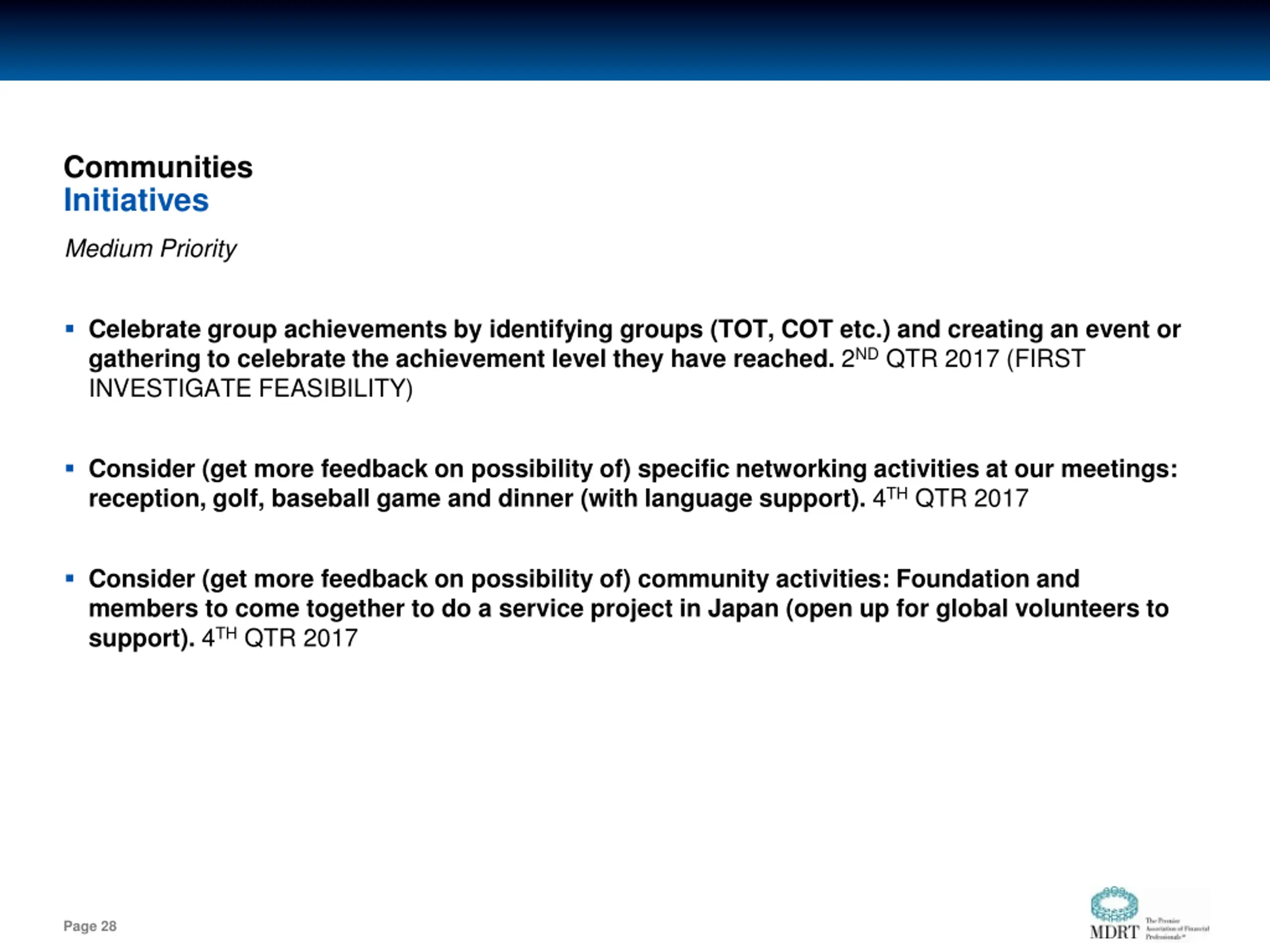Communities Initiatives Medium Priority Celebrate group achievements by identifying groups (TOT, COT etc.) and creating an event or gathering to celebrate the achievement level they have reached. 2ND QTR 2017 (FIRST INVESTIGATE FEASIBILITY) Consider (get more feedback on possibility of) specific networking activities at our meetings: reception, golf, baseball game and dinner (with language support). 4TH QTR 2017 Consider (get more feedback on possibility of) community activities: Foundation and members to come together to do a service project in Japan (open up for global volunteers to support). 4TH QTR 2017 LIMITED ACCESS Page 28