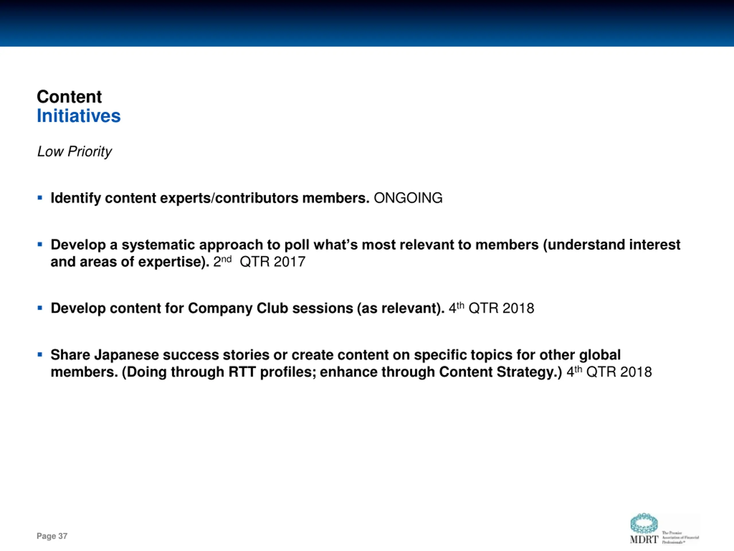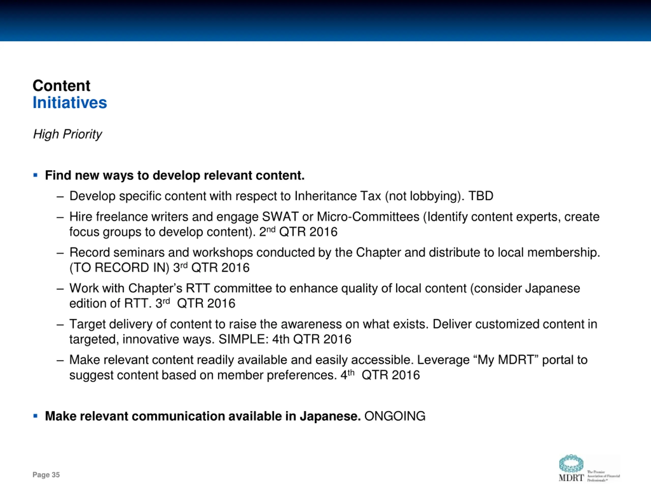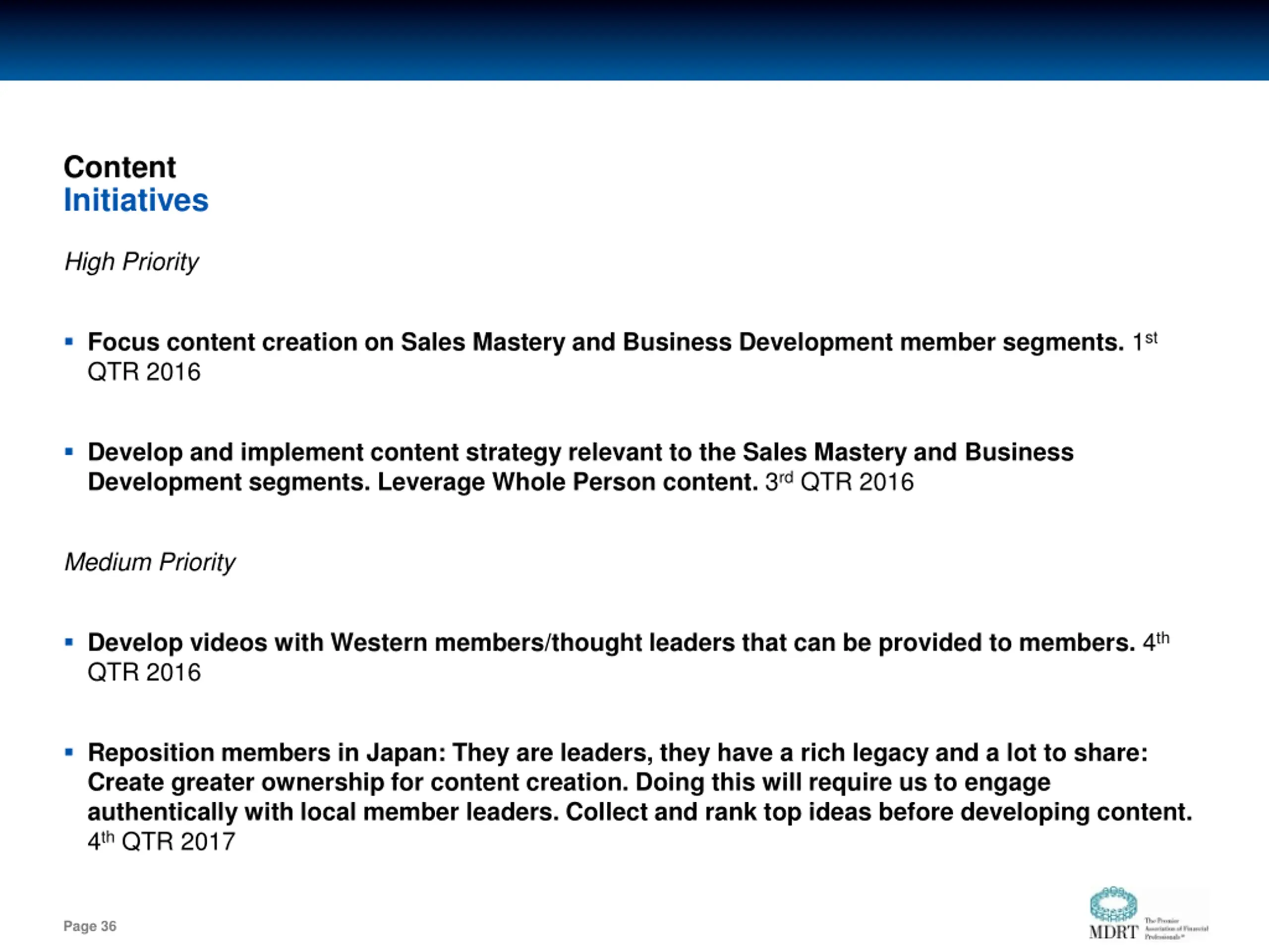Content Initiatives High Priority Find new ways to develop relevant content. Develop specific content with respect to Inheritance Tax (not lobbying). TBD Hire freelance writers and engage SWAT or Micro-Committees (Identify content experts, create focus groups to develop content). 2nd QTR 2016 Record seminars and workshops conducted by the Chapter and distribute to local membership. (TO RECORD IN) 3rd QTR 2016 Work with Chapter s RTT committee to enhance quality of local content (consider Japanese edition of RTT. 3rd QTR 2016 Target delivery of content to raise the awareness on what exists. Deliver customized content in targeted, innovative ways. SIMPLE: 4th QTR 2016 Make relevant content readily available and easily accessible. Leverage My MDRT portal to suggest content based on member preferences. 4th QTR 2016 Make relevant communication available in Japanese. ONGOING LIMITED ACCESS Page 35