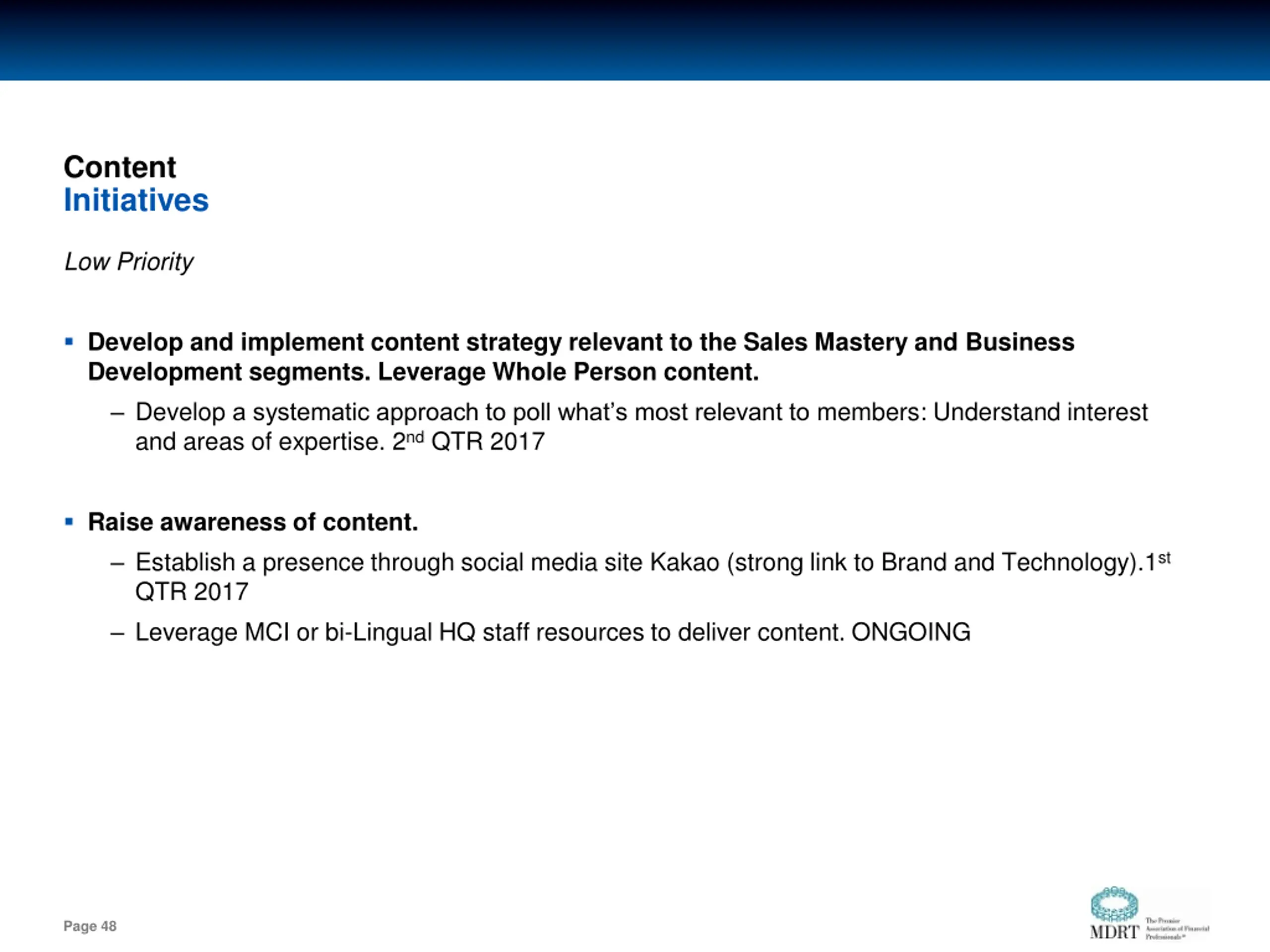 Content Initiatives Medium Priority Deliver customized content both at and outside the meeting by leveraging technology. Meeting Services: Provide translated handouts. ONGOING Meeting Services: Provide language-specific program/registration books on Web site. ONGOING Meeting Services: Reviewing electronic signage that can handle various Korean characters. 2nd QTR 2016 Meeting Services: Translate the meetings app. 2nd QTR 2016 Make relevant content readily available and easily accessible. 2nd QTR 2016 My MDRT: Suggest content based on member preferences. 4th QTR 2016 Low Priority Identify content experts/contributors (members). ONGOING Work with chapter s RTT committee to develop more Korean content. 3rd QTR 2016 Work with allies (non-chapter companies) to identify content experts and develop Korean content. 4th QTR 2016 LIMITED ACCESS Page 47