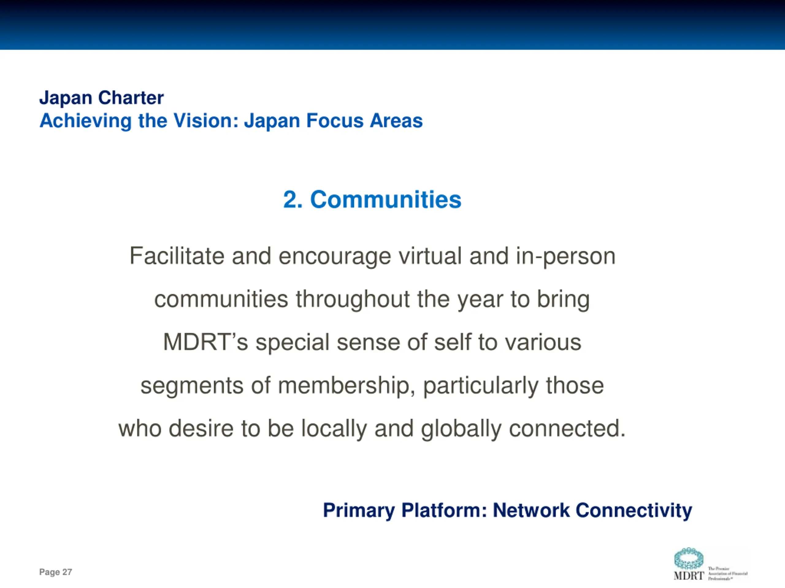 Japan Charter Achieving the Vision: Japan Focus Areas 2. Communities Facilitate and encourage virtual and in-person communities throughout the year to bring MDRT s special sense of self to various segments of membership, particularly those who desire to be locally and globally connected. Primary Platform: Network Connectivity LIMITED ACCESS Page 27